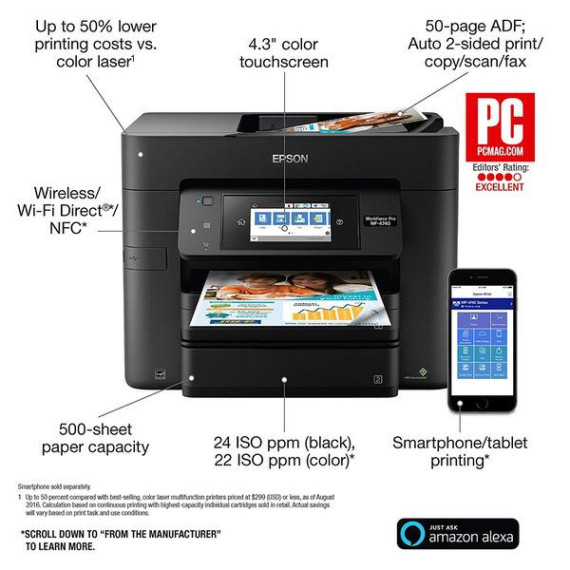 Make sure this fits by entering your model number. Get Performance Beyond Laser — the WorkForce Pro WF-4740, powered by PrecisionCore. Lightning fast color print speeds — fastest in its class (1); 24 ISO ppm (black) and 22 ISO ppm (color) (). Easy on the budget — up to 50 percent lower printing costs vs. color laser (2). Replace paper less often — 500-sheet capacity, with two paper trays to accommodate different sizes and media types, including envelopes. Enhance your productivity — 50-page Auto Document Feeder and auto 2-sided printing, copying, scanning and faxing. Never run out of ink again - Printer features Amazon Dash Replenishment which, after activation, keeps track of your ink usage and orders more from Amazon when you are running low.
