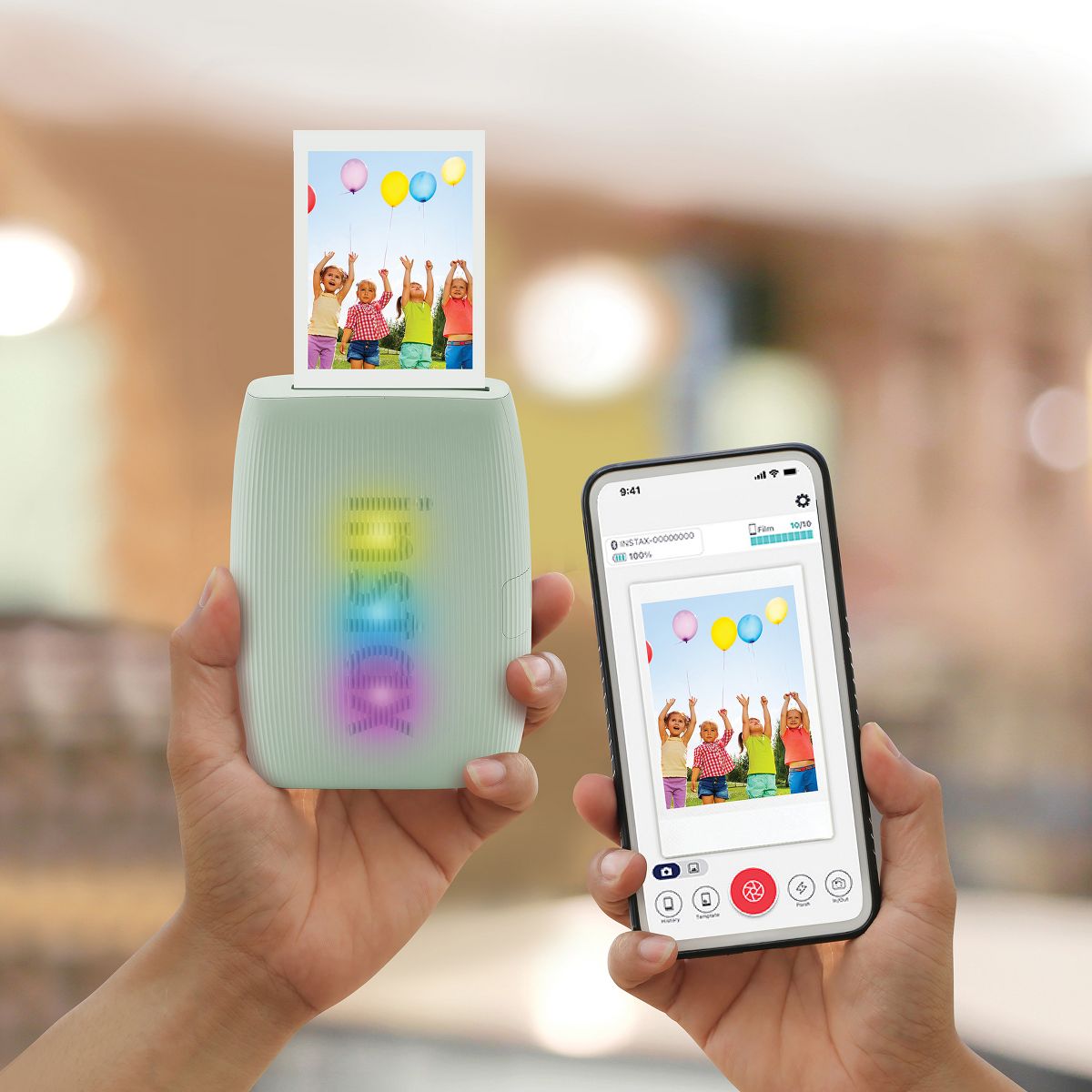The Fujifilm Instax Mini Link 3 Smartphone Printer comes with 20 Fujifilm Mini Films, Printer Case, Decorative Stickers and a Quality Photo Micro Cloth for all surfaces, lenses and more. This ultra-portable fancy upgraded printer is to use to print photos using the Instax Mini Link App via Bluetooth -Free download Print mode- Print photos easily and quickly, edit and print one frame out of a video. Printer + Camera. Converts into an Instax camera by tilting to zoom and using the power button to shoot. Use the free downloadable Instax mini–Link App to easily print an image right from your Smartphone in only 15 seconds (film development time approximately 90 seconds)! You can even print your favorite still from a video!