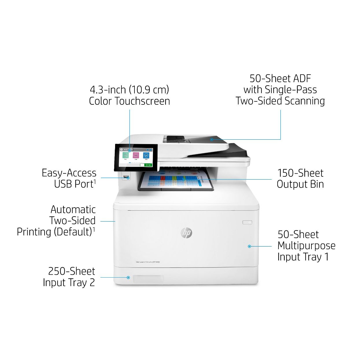Overview - HP’s entry-level Enterprise-class Color MFP with speeds up to 28 ppm and strongest security. - HP Office Laser Multifunction Printers are designed for SMBs and small workteams in larger companies, delivering enhanced productivity, simplified workflows and reduced costs. - This printer is intended to work only with cartridges that have a new or reused HP chip, and it uses dynamic security measures to block cartridges using a non-HP chip. Periodic firmware updates will maintain the effectiveness of these measures and block cartridges that previously worked. A reused HP chip enables the use of reused, remanufactured, and refilled cartridges. Features Easy to use, simple to manage - HP FutureSmart firmware can be updated with the latest featuresto optimize your investment for years to come. The world’s most secure printing - The operating code (BIOS) is automatically checked duringstartupand repairs itself if compromised. Enhanced productivity to empower work teams - Give workgroups what they need to succeed with hundreds of HP and third-party solutions and card reader support. Sustainability is smart business - Help save paper right out of the box. Two-sided (duplex) printing is set at default for automatic savings. Minimum system requirements - 2 GB available hard disk space Internet connection or USB port Internet browser. What's in the box? - HP Color LaserJet Enterprise MFP M480f printer; HP Black Original LaserJet Toner Cartridge (~2,400 pages) HP Cyan, Magenta, Yellow Original LaserJet Toner Cartridges (~2,100 pages each); Getting started Guide; 1 Power cord Disclaimers - HP’s most advanced embedded security features are available on HP Managed and Enterprise devices with HP FutureSmart firmware 4.5 or above. Claim based on HP review of 2019 published features of competitive in-class printers. Only HP offers a combination of security features to automatically detect, stop, and recover from attacks with a self-healing reboot, in alignment with NIST SP 800-193 guidelines for device cyber resiliency. - Some features enabled by future HP FutureSmart firmware upgrades may not be available on older devices, if forexample, physical product characteristics limit the functionality of the new feature. - Third-party certification based on Common Criteria Information Technology Security Evaluation ISO/IEC 15408 Standard requirements as of May 2019. Certification applicable to HP Managed and Enterprise devices running HP FutureSmart Firmware version 4.5.1 and later. - Use of the HP Trusted Platform Module may require a firmware upgrade. - Wireless performance is dependent on physical environment and distance from access point and may be limited during active VPN connections. - Dependent upon country setup specifications. - HP Secure Print is optional and requires a license. - Measured using ISO/IEC 24734, excludes first set of test documents. Exact speed varies depending on the system configuration, software application, driver, and document complexity. - Measured using ISO/IEC 24734, excludes first set of test documents. Exact speed varies depending on the system configuration, software application, driver, and document complexity.