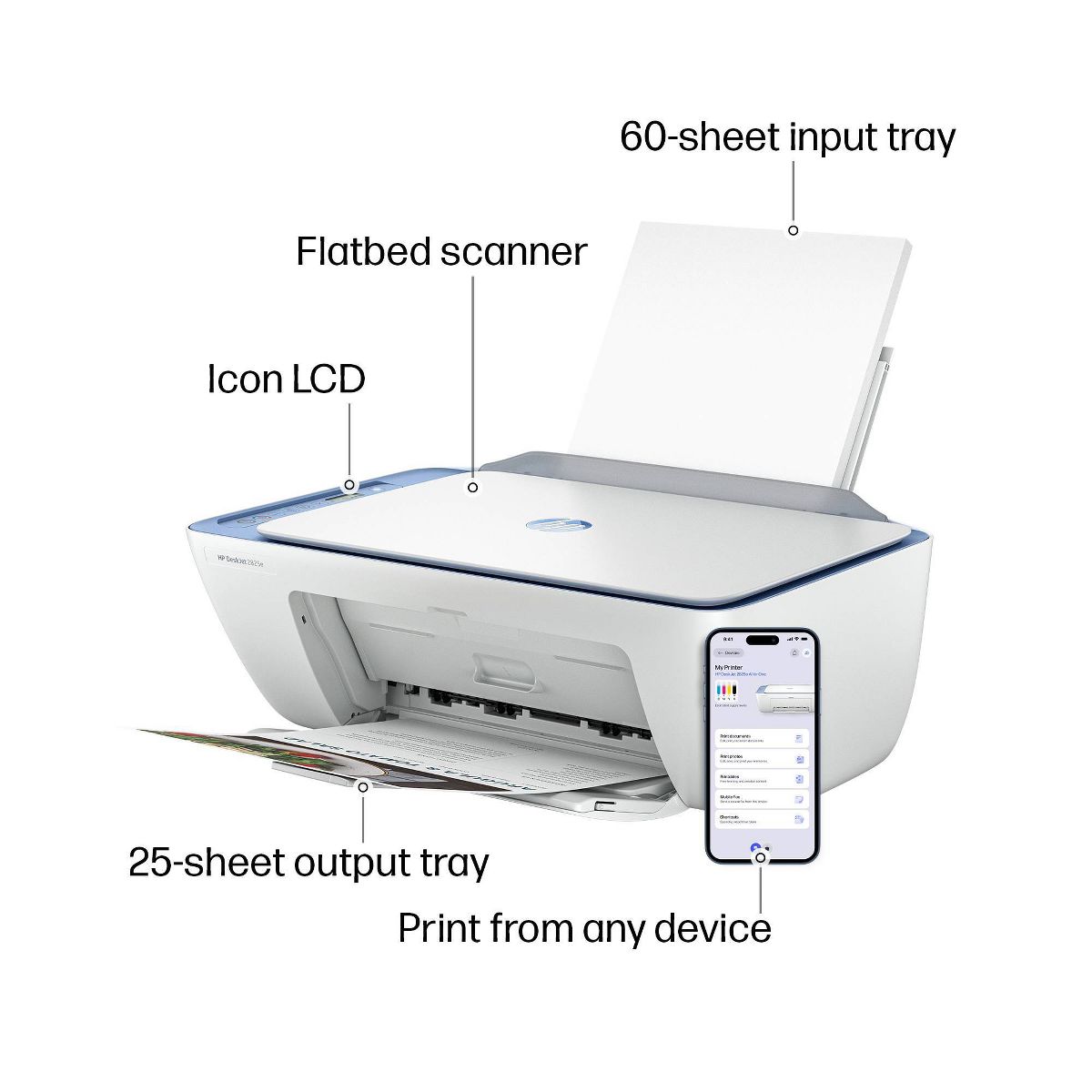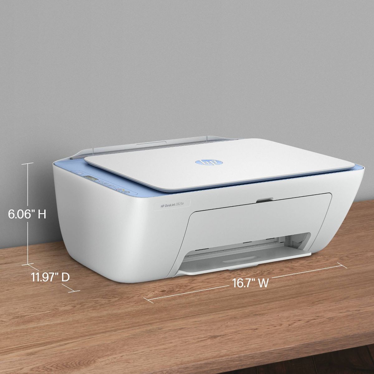 The HP Deskjet 2825e delivers color printing, 60-sheet paper capacity, and a flatbed scanner for easy scanning and copying. It also includes 3 months of free Instant Ink with HP+ activation at printer setup.