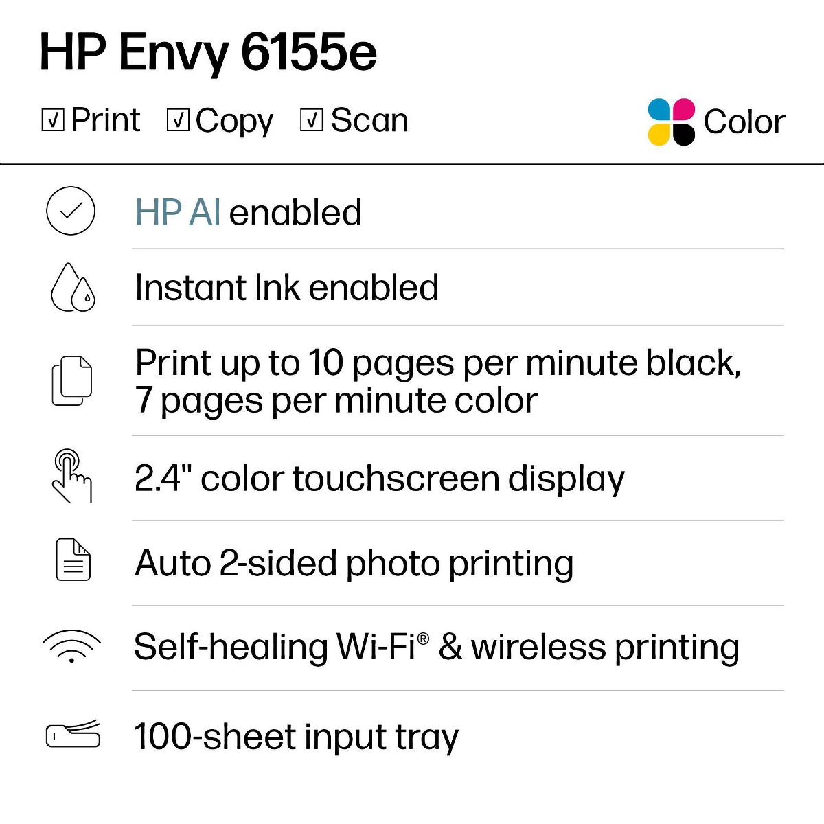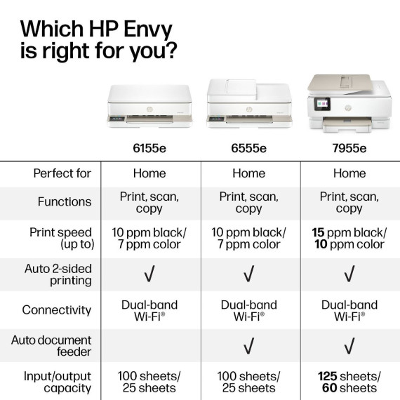 FROM AMERICA'S MOST TRUSTED PRINTER BRAND: The Envy 6155e is perfect for homes printing everyday high-quality color documents like homework and borderless photos. Print speeds up to 7 ppm color, 10 ppm black.