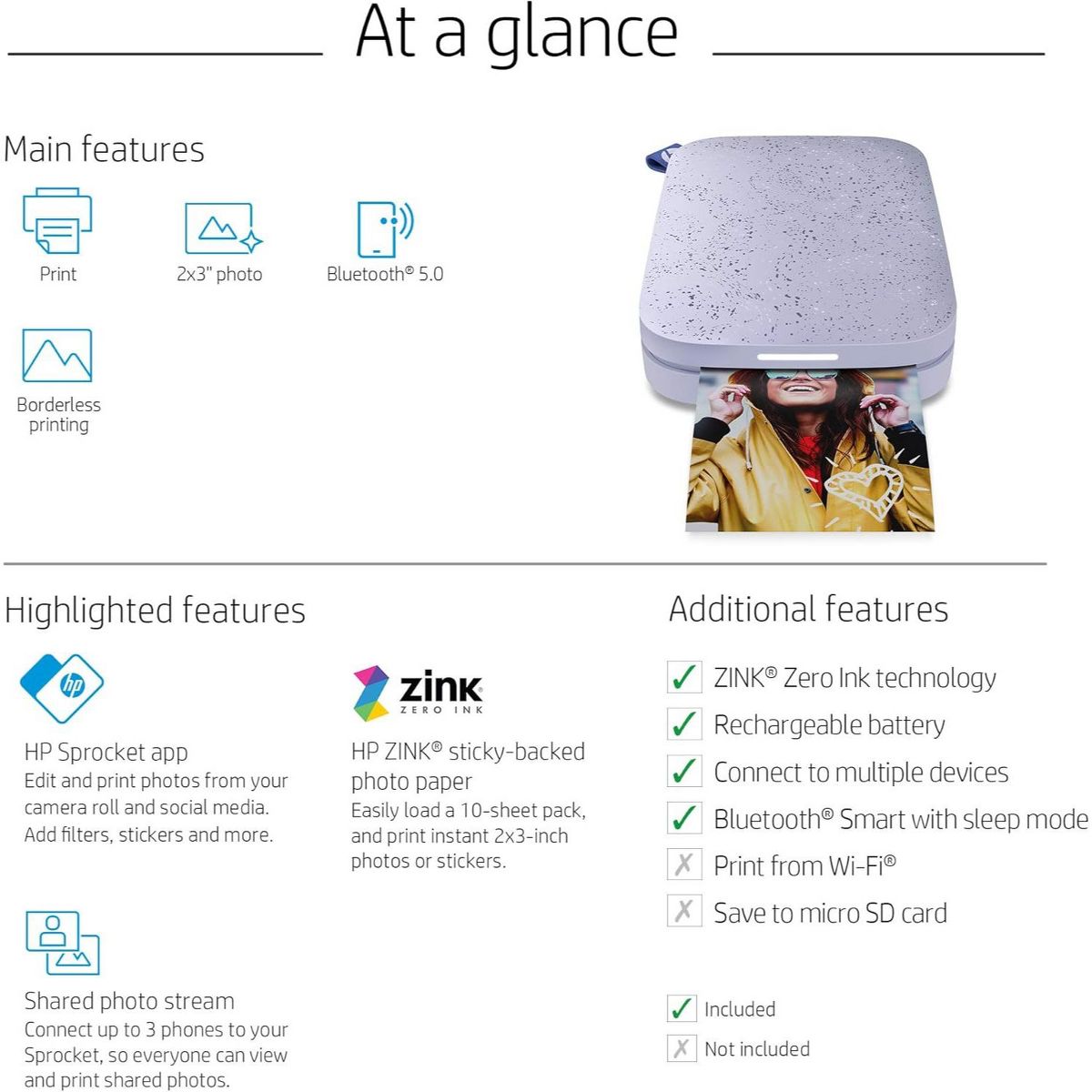HP Sprocket 2x3" Instant Smartphone Photo Printer 75 Sheets Bundle, Wireless Portable Printer - Purple