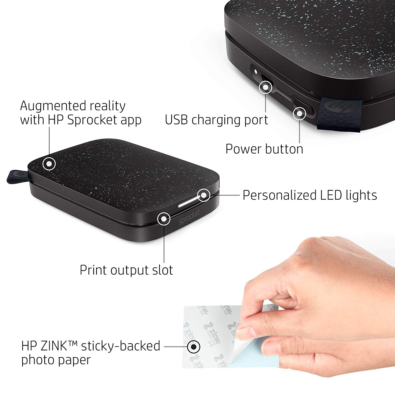 Make sure this fits by entering your model number. INSTANT PHOTOS ON THE GO – Easily print your favorite adventures on 2x3" sticky-backed photo paper with this noir black smartphone-sized photo printer that's designed to easily slip into your pocket, purse, or backpack GET THE PRINT PARTY STARTED – Now you can connect multiple devices so you and your friends can print at the same time – plus the personalized LED light shows you whose photo is printing! AUGMENTED REALITY FUN – Scan your Sprocket using your smartphone and the Sprocket app to view a virtual photo queue of print jobs and more as we continually add new features to the app SHARE THE MOMENTS – Share customized photo albums with friends using the HP Sprocket app and keep the fun going PERSONALIZE YOUR PRINTS – Decorate, design and print your social media photos with the HP Sprocket app so you can decorate your walls with your favorite photos ALWAYS CONNECTED – Now with Bluetooth 5.0 and sleep mode, HP Sprocket stays connected when not in use so it’s ready to print the moment you are, without draining your battery INCLUDES HP ZINK PHOTO PAPER – Load the 10 sheets of 2x3-inch paper into your pocket printer and create smudge-proof prints; this paper has peel-and-stick backing for instant photos or stickers WARRANTY - One-year limited hardware warranty