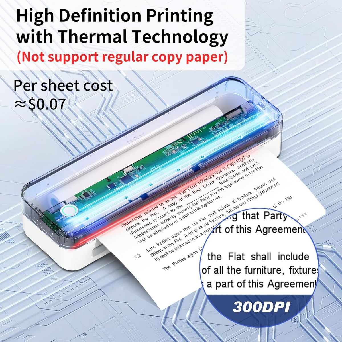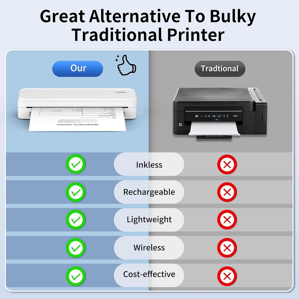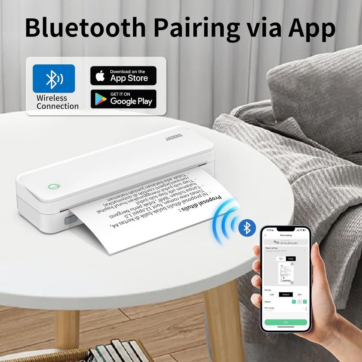 The JADENS PD-A4 Portable Thermal Printer is a smart, ink-free solution for everyday document printing—perfect for home, school, and small office use. This bundle includes 200 sheets of standard letter-size thermal paper (8.5” x 11”), giving you everything you need to start printing immediately with no ink, toner, or cartridges required. Compact and battery-powered, it’s built for mobility. Whether you're printing in your car, during travel, or on a business trip, this printer handles contracts, forms, study materials, boarding passes, and more with ease. Setup takes just 5 minutes via Bluetooth (using the JADENS Printer app for iOS and Android) or USB for Windows, Mac, ChromeOS, and Linux. With two built-in 2600mAh batteries, it prints up to 360 sheets per charge and offers 3 hours of continuous use or 90 days of standby time. The adjustable feed tray supports paper widths from 2" to 8.5", including full letter-sized sheets. Lifetime tech support via phone and email ensures help is always available.