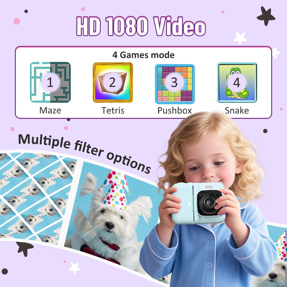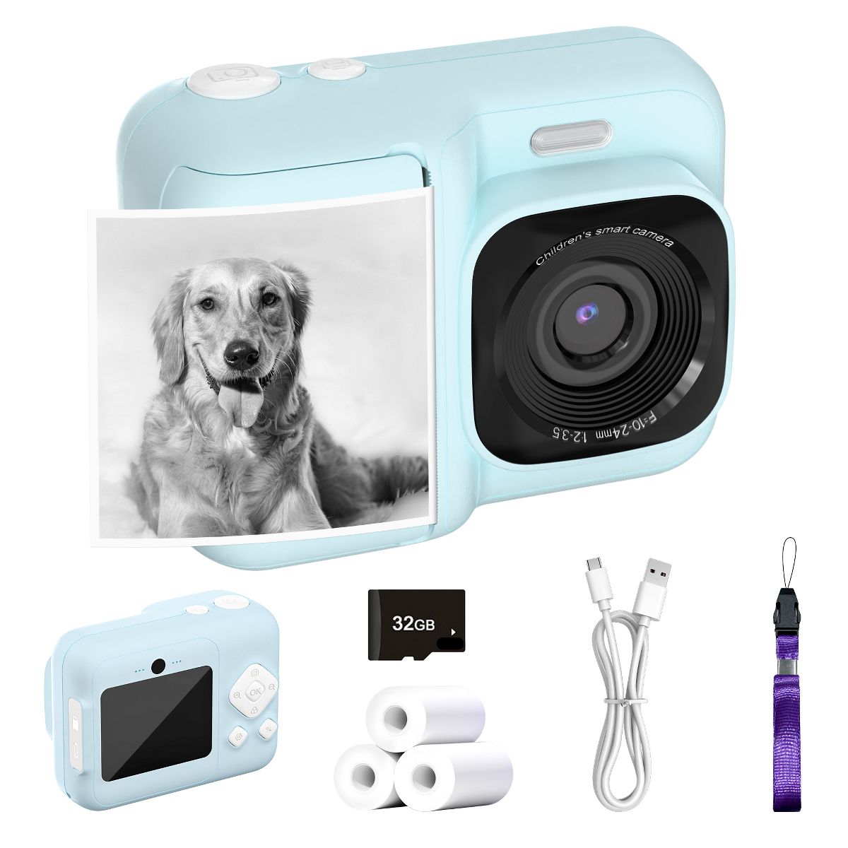Funny Instant Print Camera : This kids camera instantly prints black-and-white photos in just 1 second using thermal technology, while saving full-color versions to the included 32GB SD card. With 3 rolls of printing paper, children can snap, print, and doodle on their creations for endless fun.