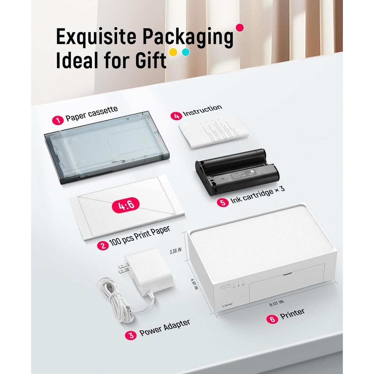 Capture life’s best moments and bring them to life with the Liene 4×6 Photo Printer. This compact, portable printer delivers stunning, lab-quality prints with vibrant colors and crisp detail—perfect for keepsakes, gifts, scrapbooks, or wall displays. Compatible with iPhone, Android, and PC, it connects via Wi-Fi for seamless printing anytime, anywhere. With premium photo paper and fade-resistant technology, your memories stay vivid for years to come. Each set includes 100 sheets of premium photo paper and 3 ink cartridge refills, so you can start printing right out of the box. Customize and edit your prints effortlessly using the intuitive Liene Photo App.