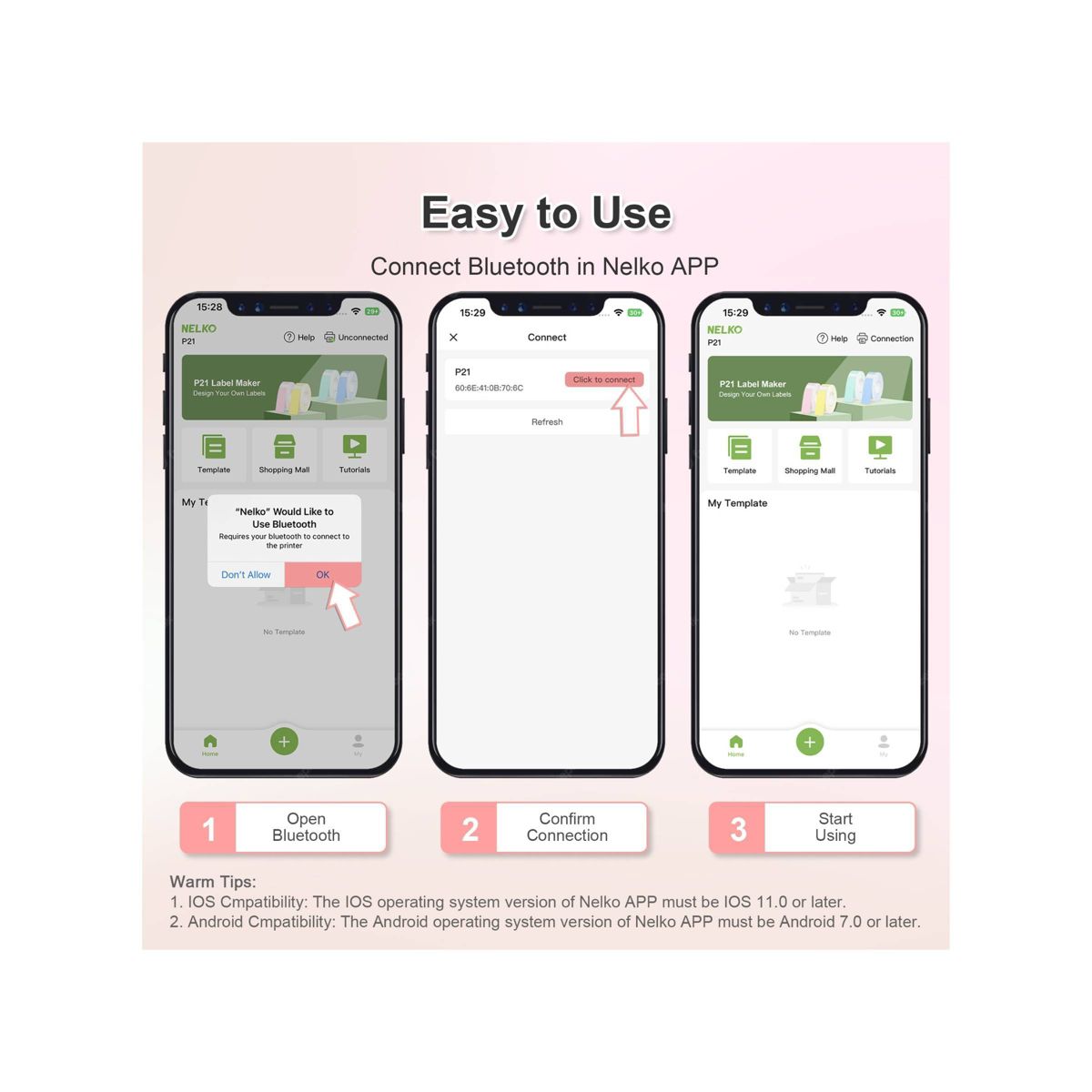 Nelko P21 Compact, light, easy to carry around. This unit is equipped with a Bluetooth connection (to mobile phones, support app, custom editing tags). This unit has a print speed of up to 20 mm/s and the P21 also supports different specifications of gap paper. One built-in roll of label with one extra roll in the box. The unit can also print any length of label according to demand!