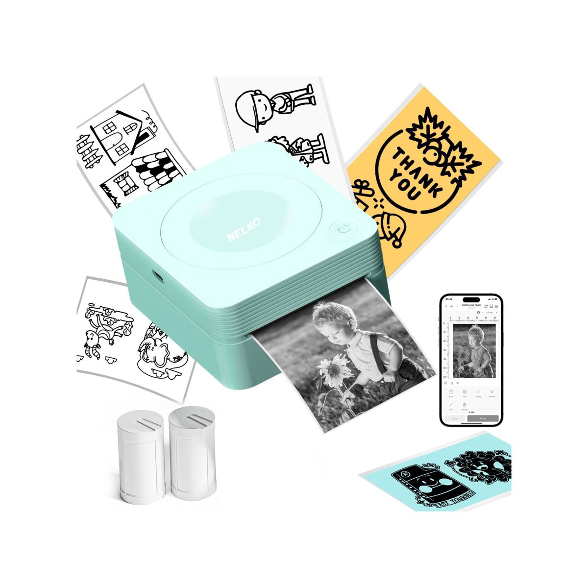 Nelko PM230 - Mini photo printer is small and designed for children. Connect the mobile phone with Bluetooth or connect the MAC system with USB, combined with a support app to customize and edit the labels. This unit boasts Intelligent identification of consumables specifications, loading and printing. This removes the manually process to confirm the size. Provide a variety of fonts, filter effects and themes to make your black and white images more high-definition with the PM230 printer. Comes with two rolls of white label.
