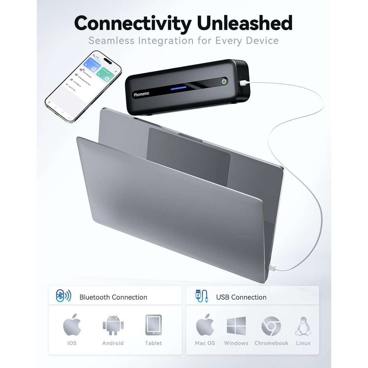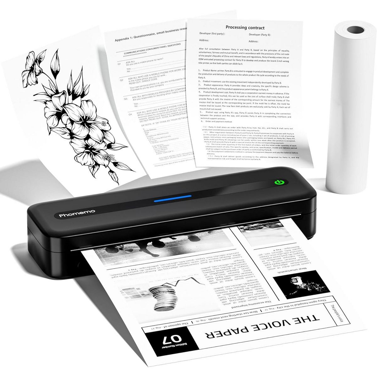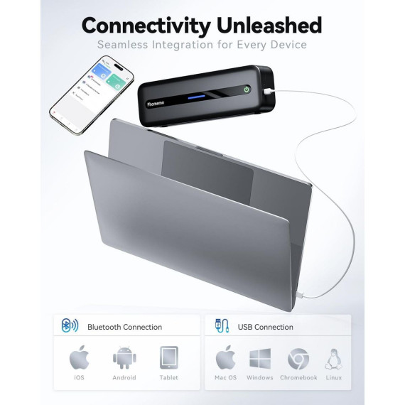 The Phomemo M832 is the ultimate high-definition printer for work-from-home and on-the-go printing. Equipped with a 300dpi print head and a built-in paper bin, this compact, inkless thermal printer delivers crisp, professional-quality documents anytime, anywhere. Its seamless Bluetooth connectivity and versatile paper support make it the perfect solution for effortless printing, whether you're at home, in the office, or traveling.