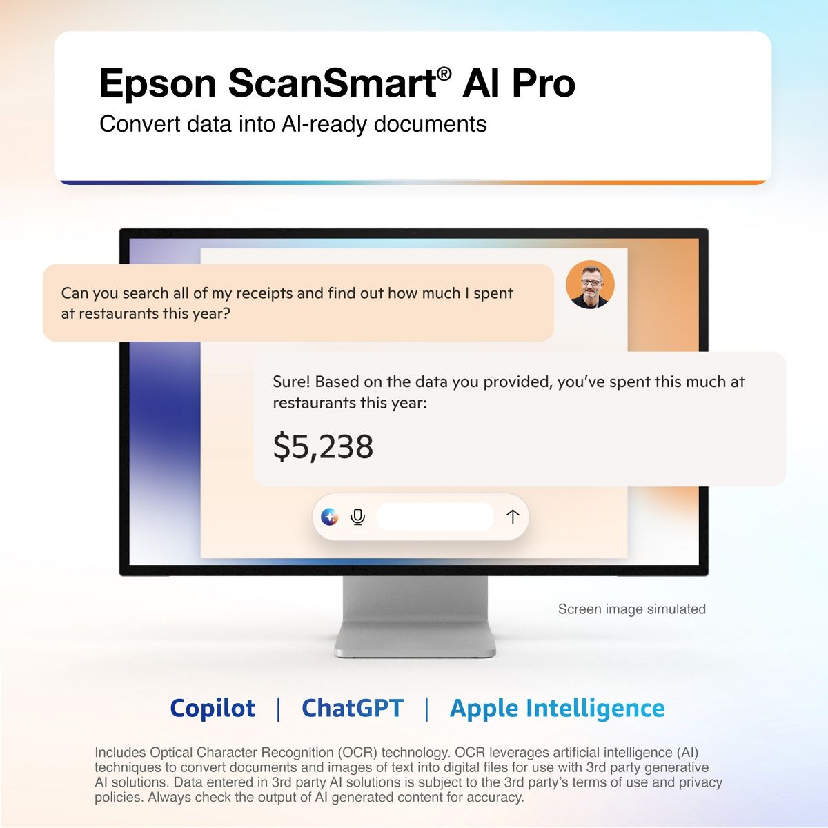 Driven by Epson ScanSmart AI PRO technology, you’ll quickly and intelligently convert scanned information into smart digital data – making your documents AI-ready for Microsoft Copilot, Apple Intelligence, ChatGPT workflows and more.