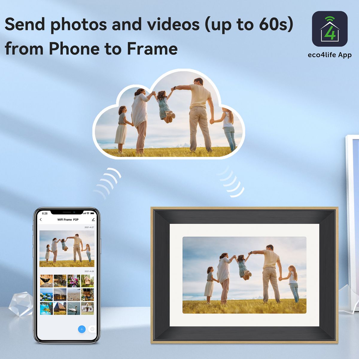 Want others to enjoy the photos you have on your phone? The eco4life 10.1-In. Wi-Fi® Digital Photo Frame will display photos and video clips (up to 60 seconds) from your phone to your frame anytime and anywhere as long as your frame is connected with Wi-Fi® (2.4 GHz only) and your mobile phone has Internet data. The photos can be displayed in slide show format plus the frame also support videos and pictures with background music from local files. It comes with built-in 16 GB memory and can support an external SD™ Card or USB flash drive up to 128 GB. The wooden photo frame with its 1280 x 800 resolution, 10.1-in. touch screen displays images clearly and vibrantly as well as let you manage pictures and videos. It also makes a great gift idea!