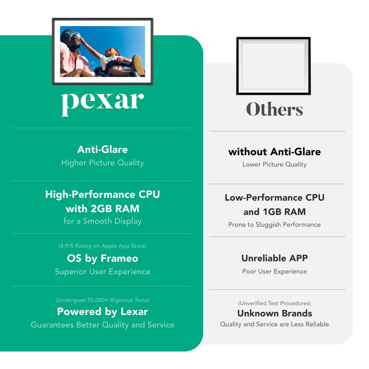 Easily and directly share photos and videos with friends and family – in high resolution that perfectly catches the moment. Bring friends and family closer with the pexar 10.1” frame. Share photos and videos via the internet in high-res while keeping your information private and secure. With easy setup, it is user-friendly for everyone, making it the ideal gift for displaying photos and videos. Powered by Lexar, a brand you know you can rely on.