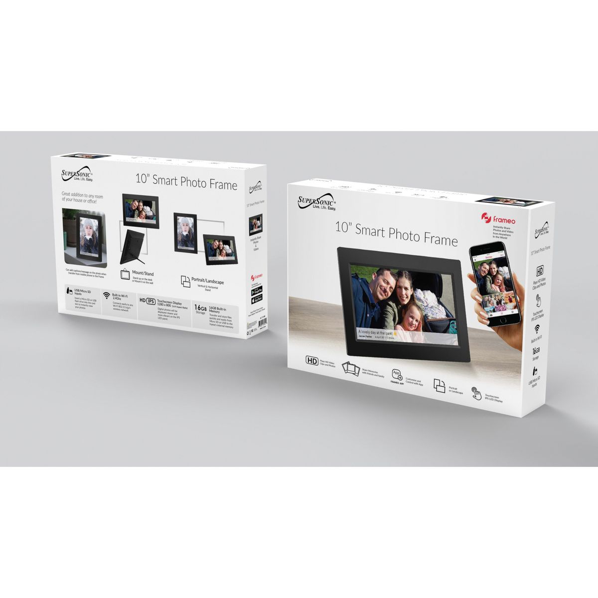The Supersonic 10.1-In. Smart Photo Frame is the ideal way to showcase your cherished memories with a modern twist. Featuring a vibrant IPS touch screen display, this frame brings your photos to life with stunning clarity and vibrant colors. With 16 GB of built-in flash memory, you can store a large collection of your favorite moments. Easily import your photos from a microSD Card or USB 2.0, supporting a maximum capacity of 32 GB. The 1280 x 800 resolution ensures every detail is crisp and clear. Stay connected with the integrated Wi-Fi® 2.4 GHz, enabling convenient control via the user-friendly Frameo app. The app allows you to send 1 or multiple photos to the frame, anytime and from anywhere. Personalize your photos by adding captions or messages, making each moment even more special. With multi-language on-screen menus and auto-rotation, you can use the frame in portrait or landscape view effortlessly. The Photo Frame comes with a built-in stand and is wall-mountable, giving you the flexibility to display it anywhere you desire. Additionally, the frame includes a sleep mode time period, allowing you to conserve power when not in use. Easily manage your photo collection by showing, hiding, or deleting photos directly from the frame. Capture memories, share joy, and relive your favorite moments with the 10.1-In. Smart Photo Frame. Bring your photos to life like never before.