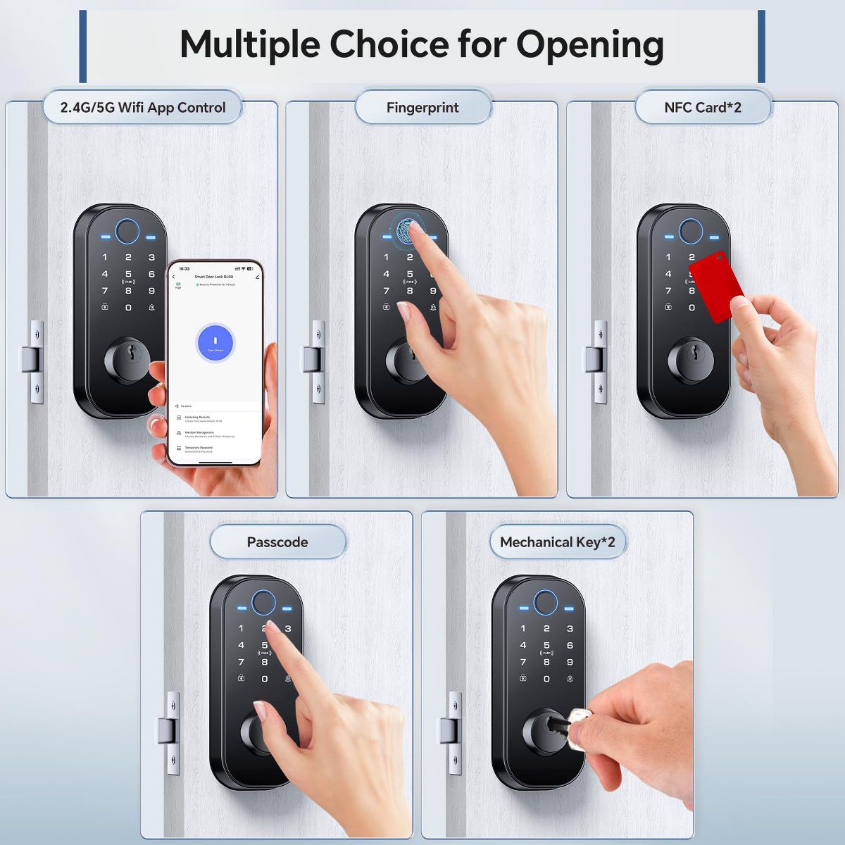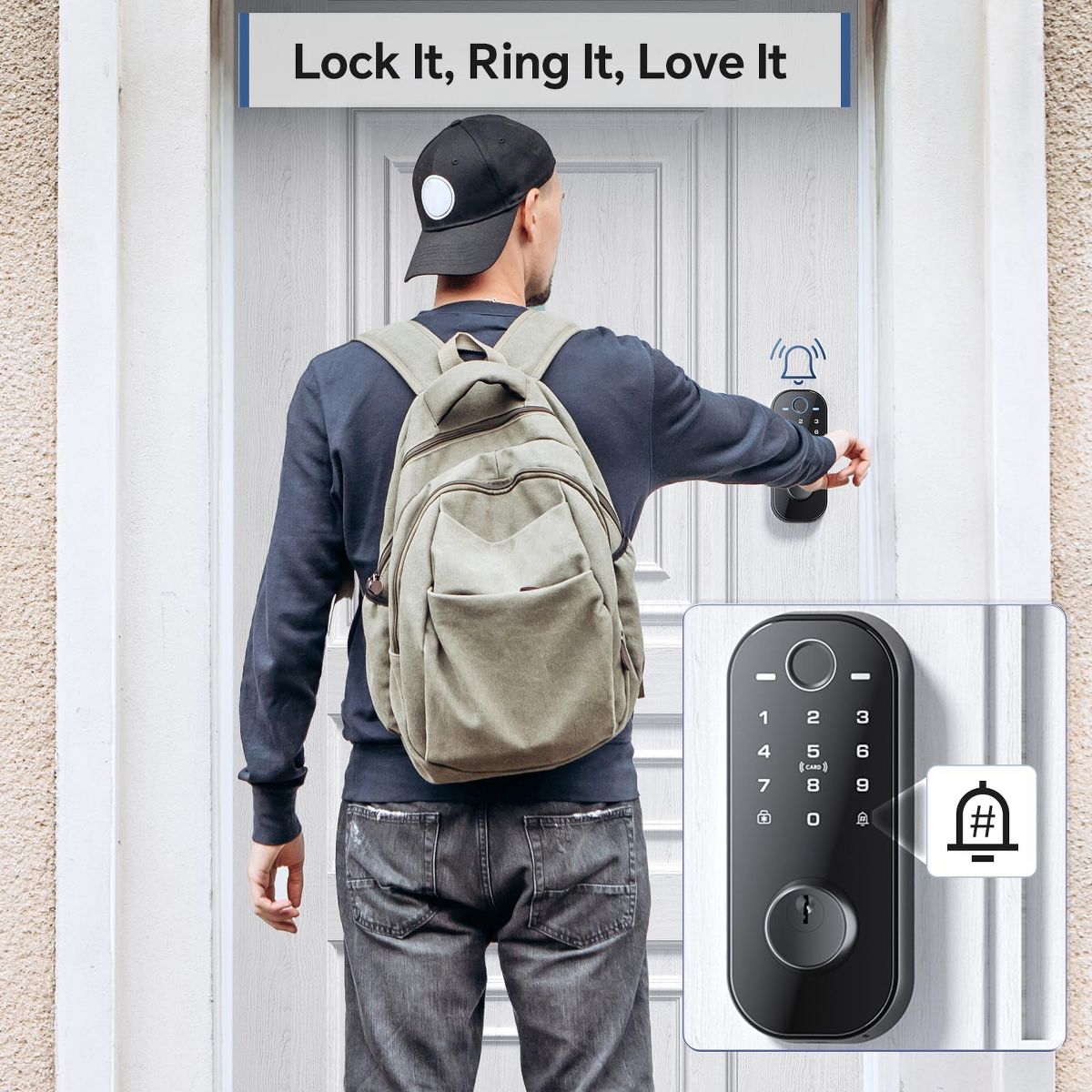 Upgrade your home security with this smart keyless entry door lock. It offers 5-in-1 unlocking options, including Wi-Fi remote control, fingerprint, passcode, fob, and backup key. With a built-in doorbell, you'll never miss a delivery. It can store up to 200 fingerprints or passcodes, making it perfect for families, roommates, or offices. The 0.2-second fingerprint scan works for all finger conditions. The built-in Wi-Fi allows for app control without an extra gateway. You can unlock the door remotely, send one-time codes for added security, and sync access logs. There are 4 smart passcode modes for flexible access. The smart auto-lock feature can be customized from 5 to 60 seconds, and one-touch lock buttons are available on both sides. The lock is made of scratch-resistant zinc alloy with an IP54 rating, suitable for various U.S. climates. It fits U.S. standard doors and can be installed in just 15 minutes with a Phillips screwdriver, no drilling required. This lock brings convenience and security to your daily life, whether you're a busy professional or a remote worker.