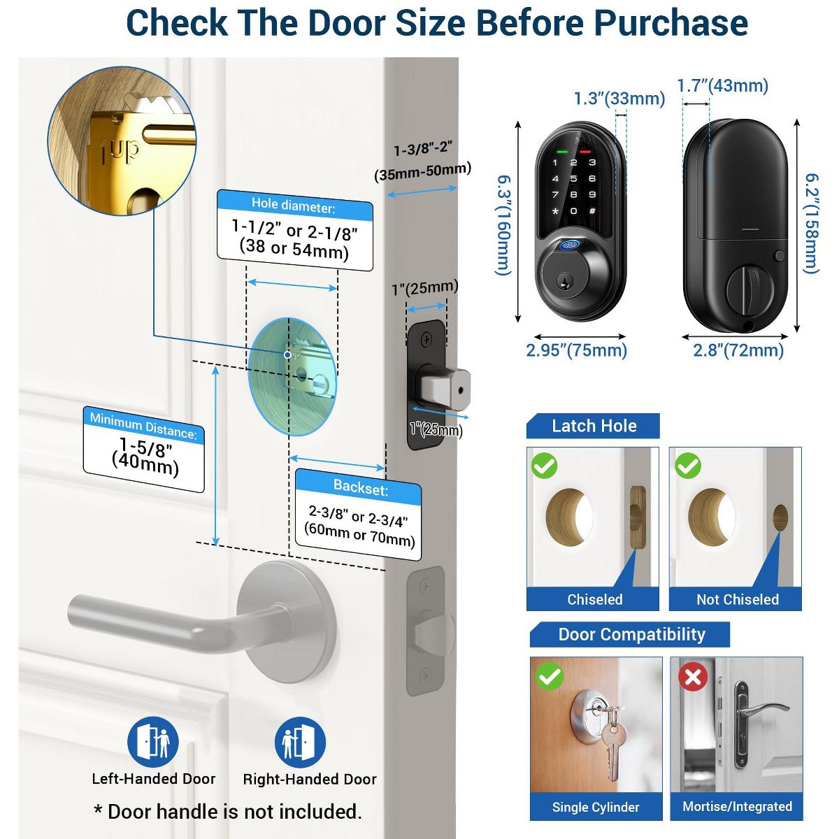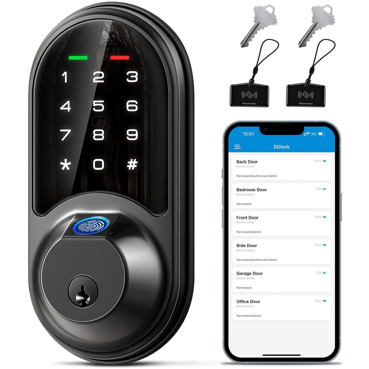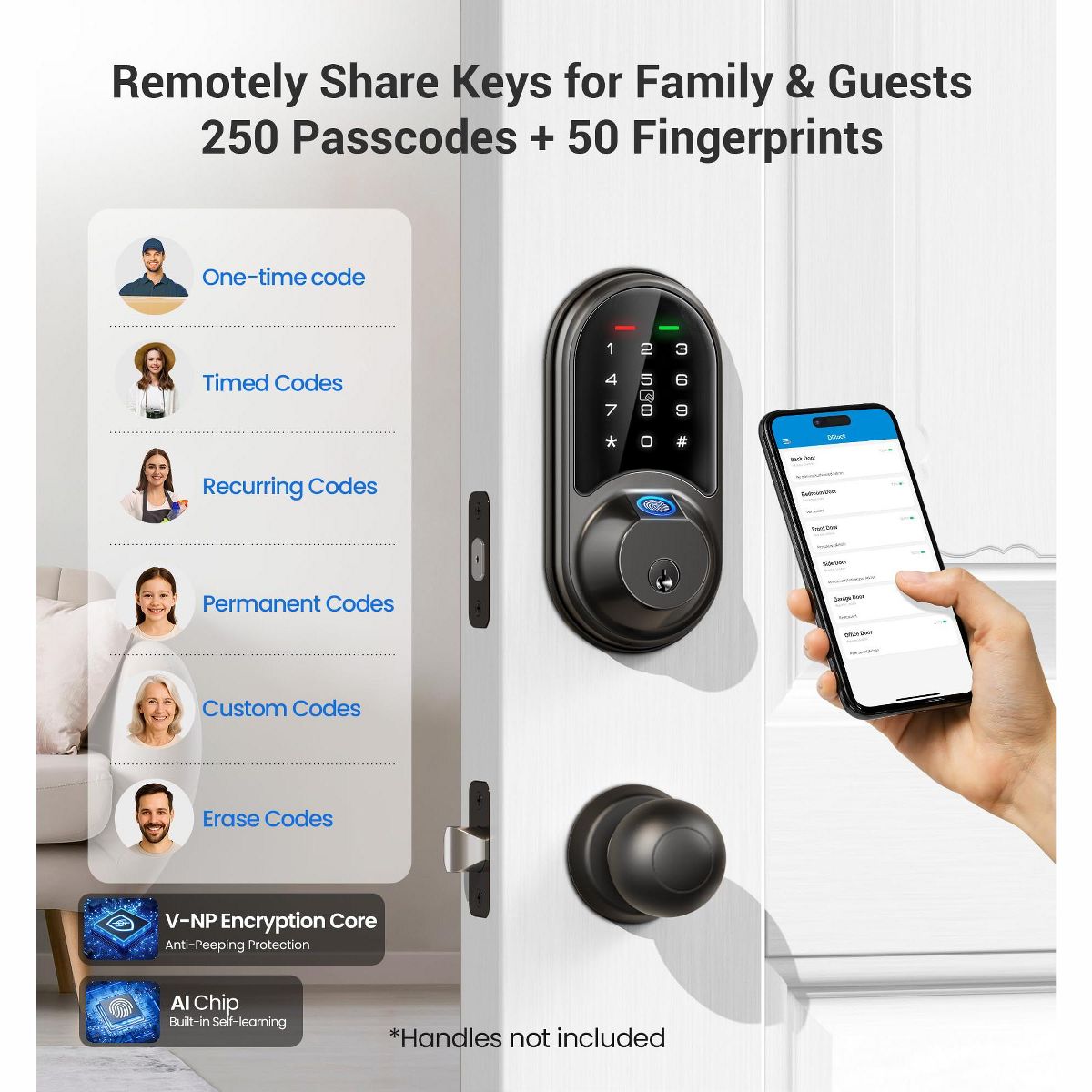 Upgrade your home security with this 7 - in - 1 smart door lock. Offering multiple access methods including fingerprint, app, web portal, fobs, code, eKey sharing, and mechanical key, it provides great convenience. The app and web portal control allow you to manage access remotely, generate eKeys, and view records for free. With a capacity for 50 fingerprints and 250+ user codes, you can share different types of codes with various users. It features enhanced security with auto - lock, privacy mode, and an anti - peeping keypad. Smart home integration enables voice control with Alexa and Google Home when paired with a separate gateway. Suitable for houses, apartments, offices, and hotels, it fits most US standard doors and can be installed easily with a screwdriver, bringing a new level of convenience and security to your life.