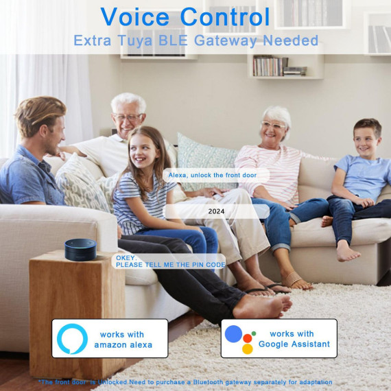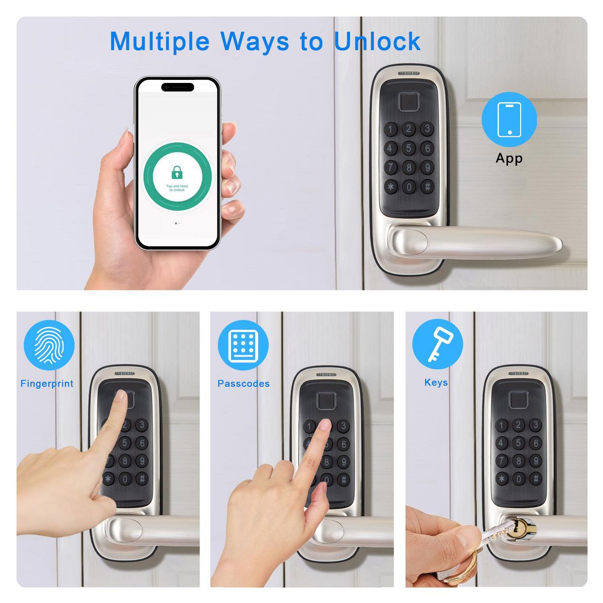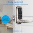 Smart deadbolt latch with 5 keyless options, app control within Bluetooth range, remote control via Tuya Bluetooth/Wi-Fi Gateway, IP56 durability, and a 10–15 minute, no-drill install.