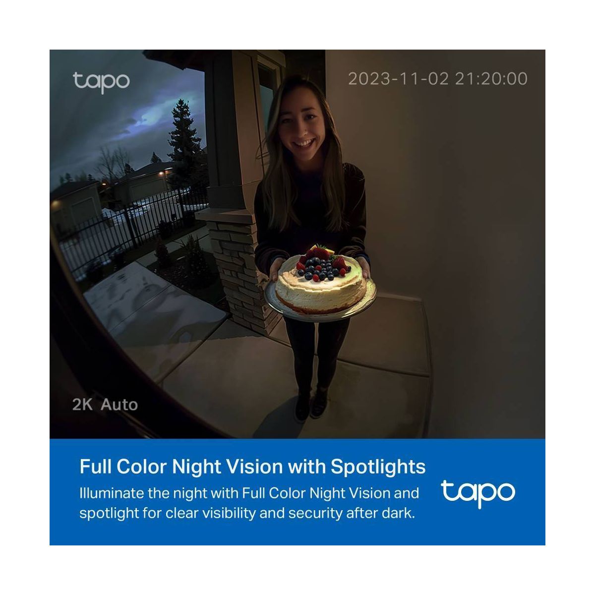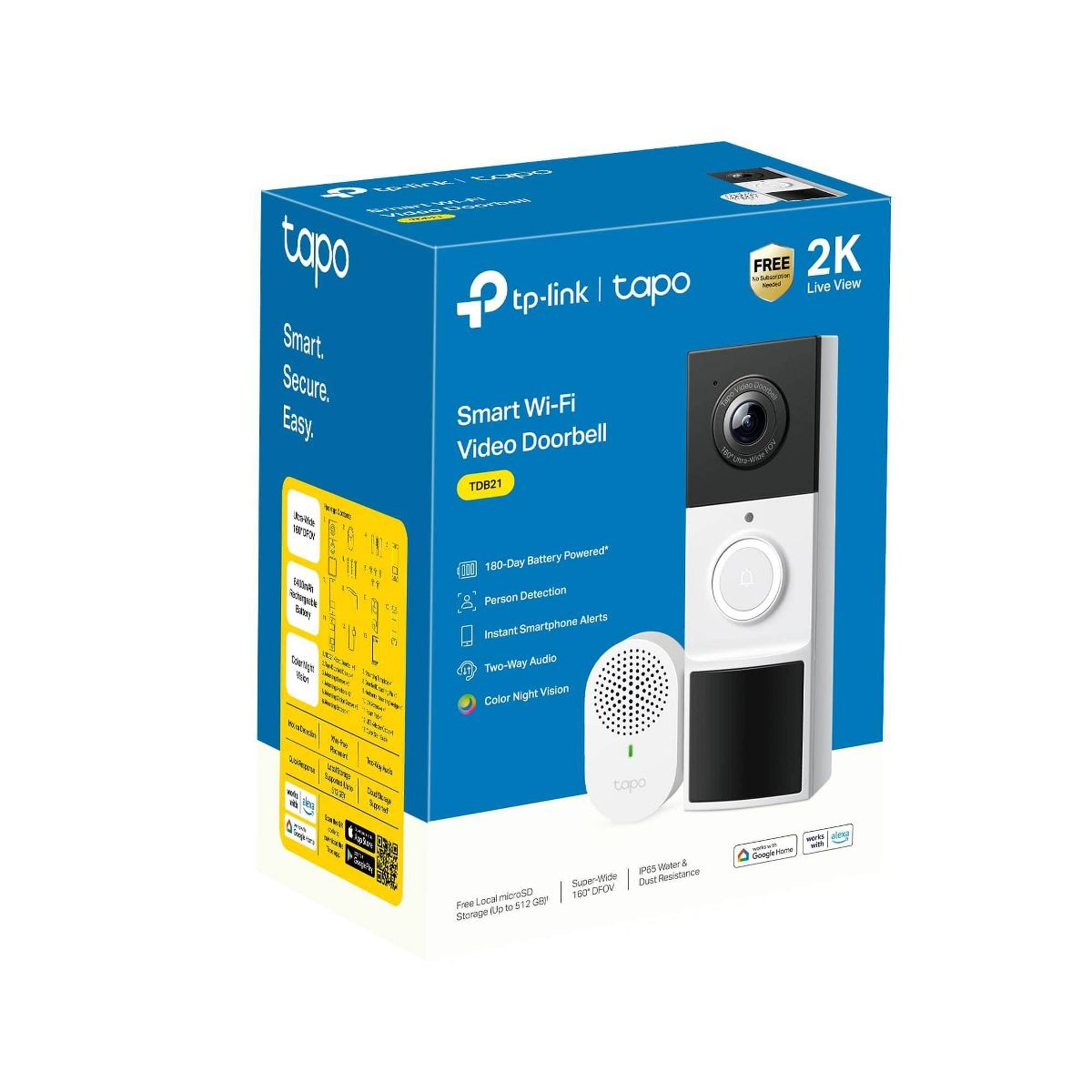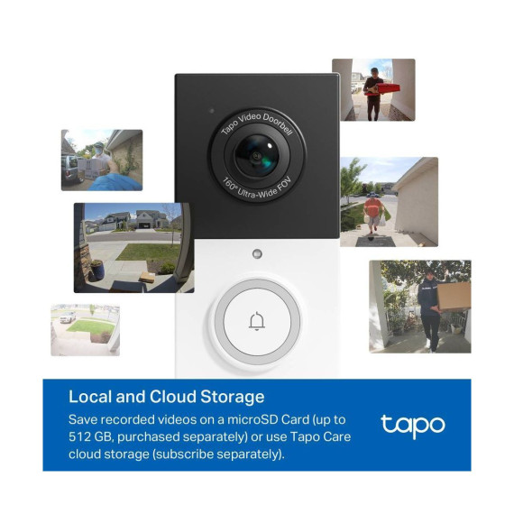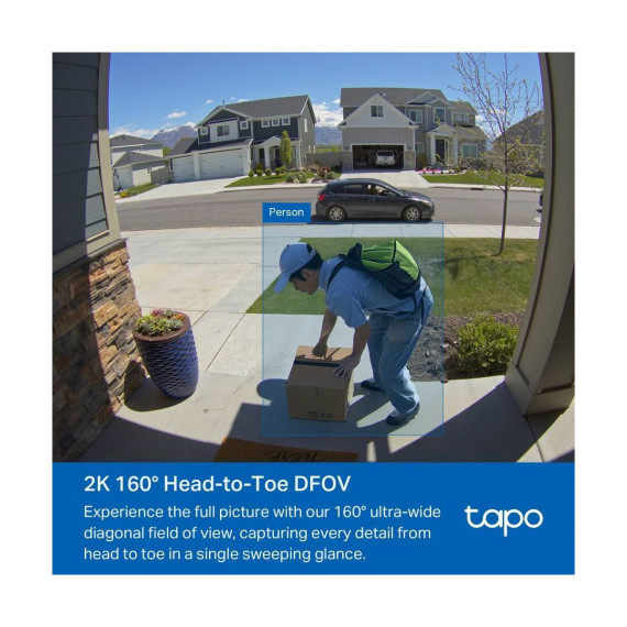 For exceptional front door and yard security, choose TDB21. Witness every detail in 2K resolution and ensure there are no blind spots with the expansive 160° head-to-toe field of view. Enjoy wire-free convenience with long-lasting battery. Choose flexible storage options with a microSD card (sold separately) or cloud storage with a Tapo Care subscription. The free smart AI feature detects people visiting your door, keeping you informed without any hidden fees. Finally, the doorbell offers clear color night vision and a spotlight for substantial security even in the darkest conditions.