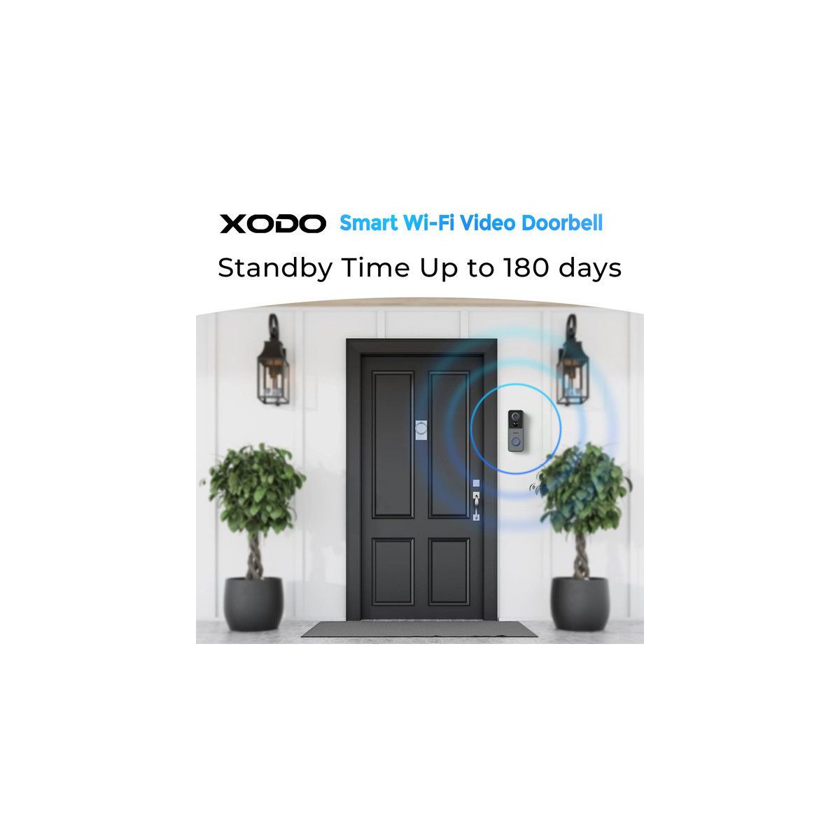 The XODO Smart Wi-Fi 2k Wire Free Video Doorbell is easy to install and use. It has a rechargeable lithium-ion battery that lasts up to 180 days on a single charge. You can charge it with a USB cable (included). It also has a 2-way audio feature that lets you communicate with your visitors or deter unwanted guests. It is compatible with Android and iOS devices and works with 2.4GHz Wi-Fi networks.
