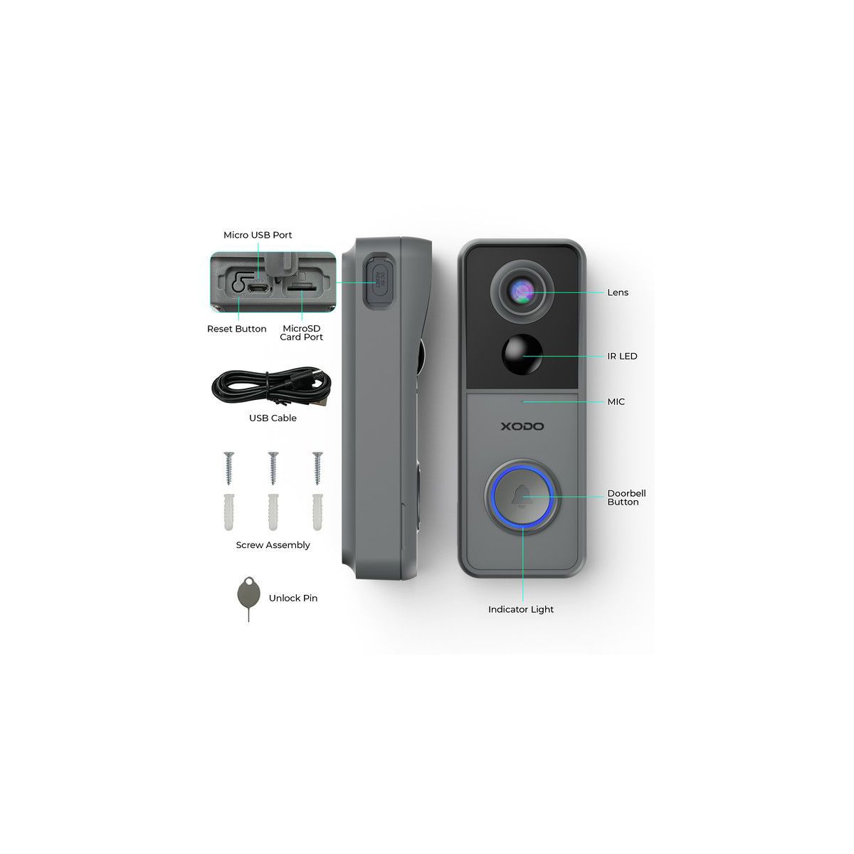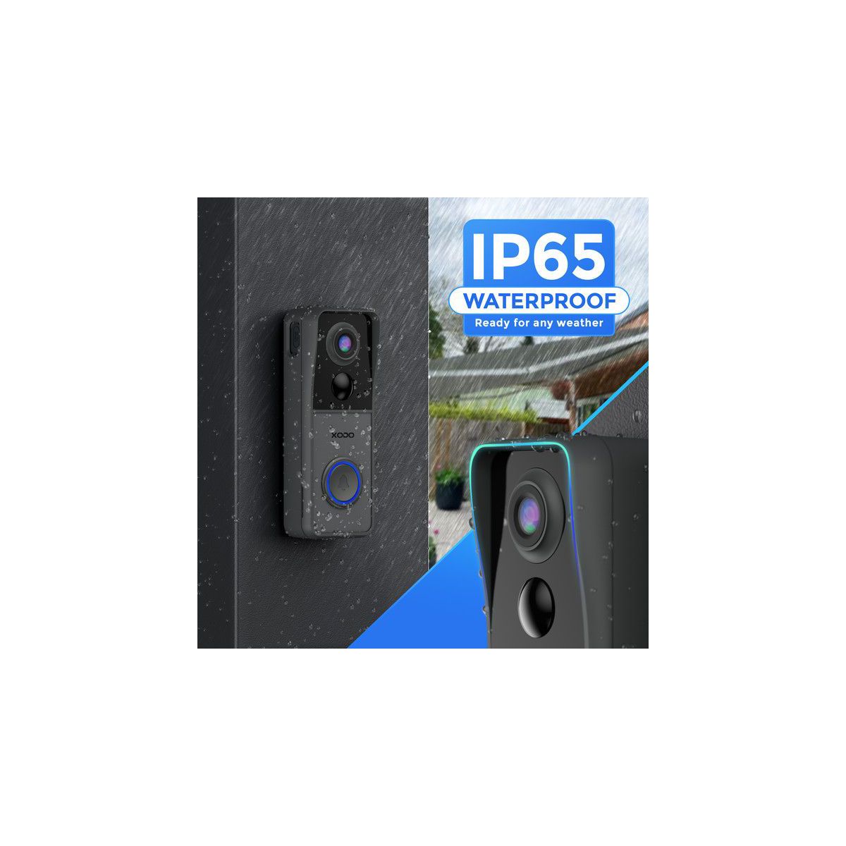 The XODO Smart Wi-Fi 2k Wire Free Video Doorbell is designed to withstand outdoor conditions. It has an IP rating of IP65, which means it is dustproof and waterproof. It also has a wide viewing angle of 100 degrees and a gray color that blends in with your home exterior. It comes with hardware mounting and screw fittings for easy installation. It also has a one-year limited warranty for your peace of mind.