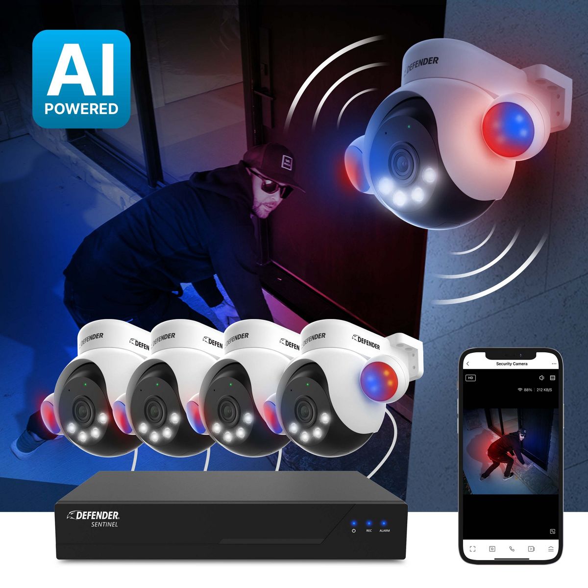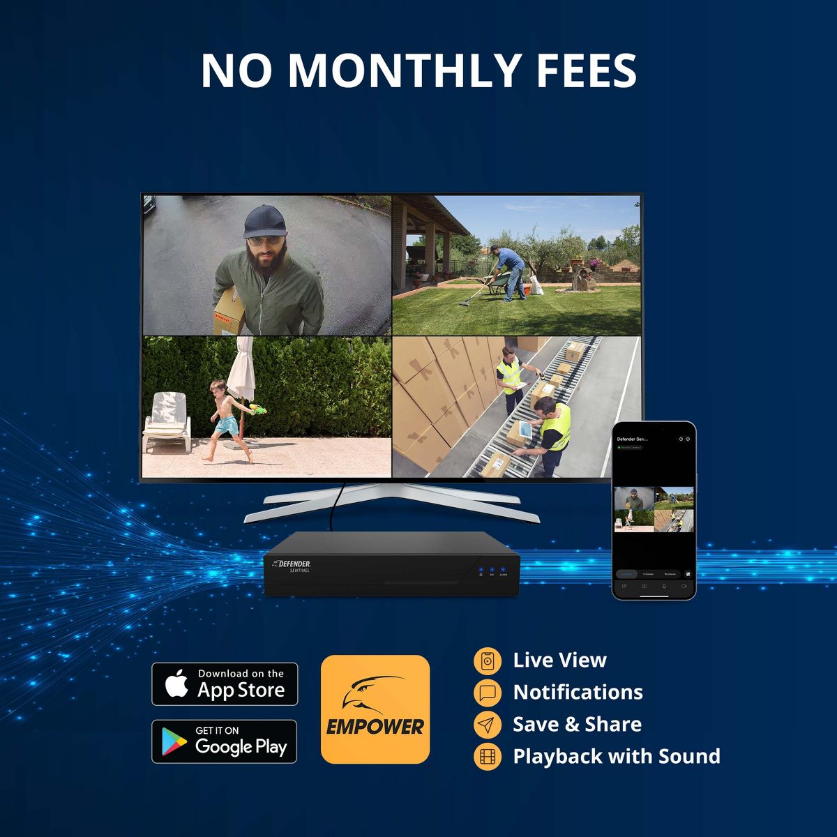 Experience the gold standard in home security with the Sentinel 4K NVR Security System. This state-of-the-art home security system integrates seamlessly into your home, providing round-the-clock 4K quality surveillance with a simple DIY Setup. The next generation of SMART AI-Powered human detection uses an intelligent detection algorithm with instant mobile notifications. Advanced deterrence features include blue-red light, and a powerful LED spotlight. Enjoy sharp audio recording, and vibrant color night vision on your durable, metal weatherproof security cameras. No monthly fees required with the top-rated Empower Mobile app.