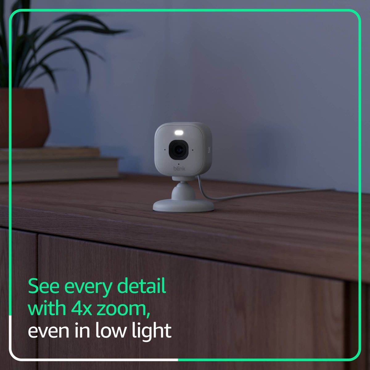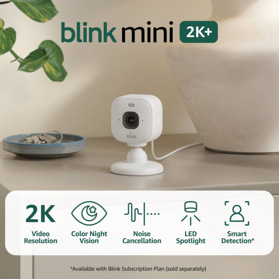 Mini 2K+ is our most powerful, compact plug-in security camera yet, delivering stunning 2K video resolution, a 138° field of view, and 4x zoom for detailed footage day or night. With AI smart detection (Blink Subscription Plan required), it can identify people or vehicles and help deter unwanted activity using a built-in security siren. Plus, you’ll get crisp two-way audio, color night vision with the spotlight, and seamless control from the Blink app. Includes one Blink Mini 2K+ camera, mounting kit including stand, USB cable, and power adapter.