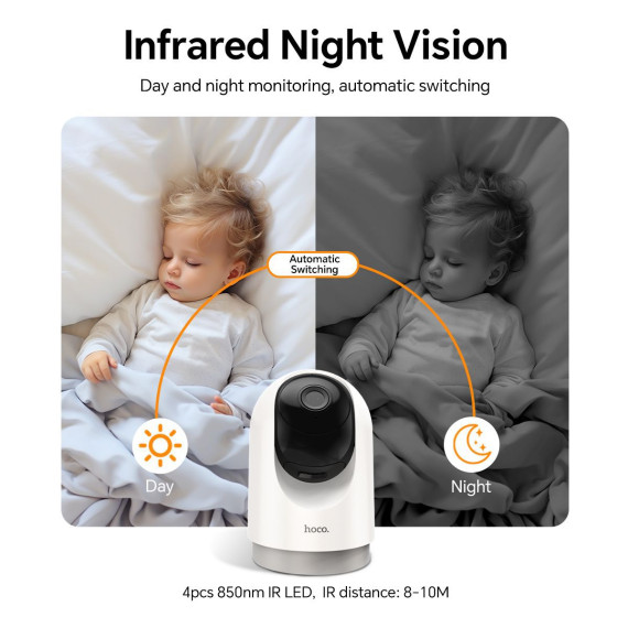 The hoco D1 Indoor HD Camera is an advanced indoor camera that delivers high-quality monitoring with a full suite of smart features. Equipped with a 3-megapixel full HD sensor (2304 × 1296), it offers sharp image quality and a complete pan-tilt-zoom (PTZ) range for dynamic coverage. The double gimbal design enables a wide 355° horizontal and 110° vertical viewing angle, ensuring no blind spots in your space. Infrared night vision and two-way audio allow seamless day-to-night monitoring and real-time communication. With support for iOS and Android devices, remote access and fast network setup are simple and secure. Whether for home or office use, this compact camera provides reliable surveillance and flexible storage options