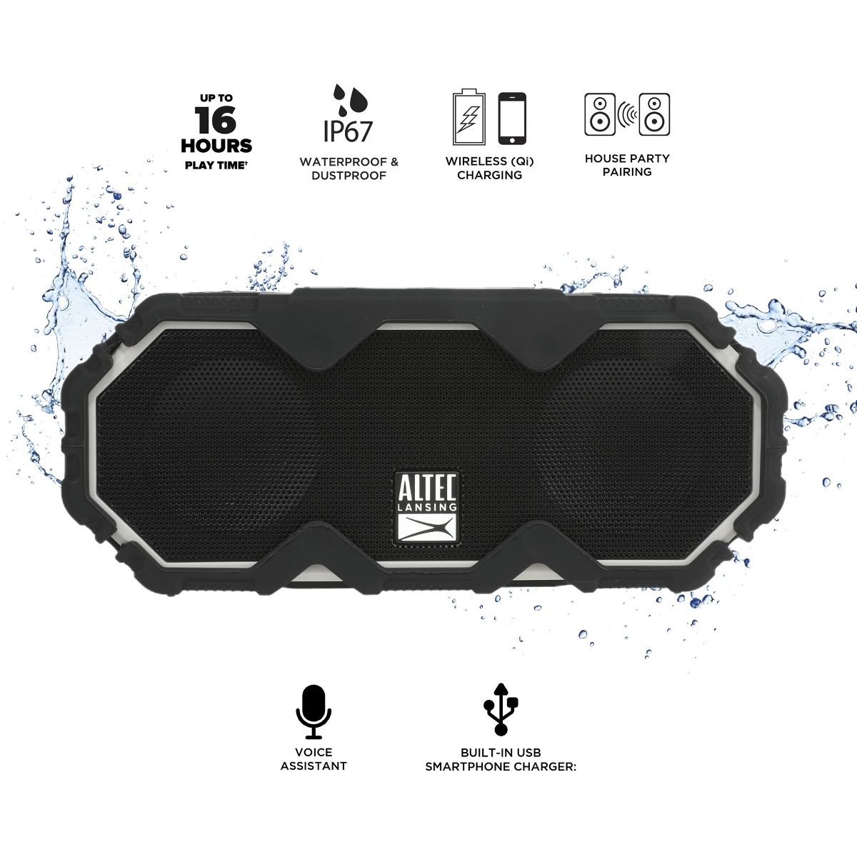 Get beach party ready with the Mini LifeJacket Jolt. This speaker is your portable charging station, bring anywhere and charge up any of your smartphone devices. With a Qi wireless charging pad built-in to the top of your speaker, simply drop your Qi enabled device and receive an instant boost! No Qi enabled phone? No problem, there is also a built-in USB charging port to plug in any of your devices and charge up! Loaded with up to 16 hours of battery life, your Mini LifeJacket Jolt will stay powered for your entire listening experience. With a certified IP67 waterproof rating, you'll never have to fret the elements – this speaker is waterproof, shockproof, snowproof and will even float in water! Need extra sound? Pair multiple Altec Lansing speakers together with House Party Pairing for a multi-room sound.