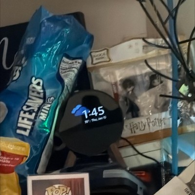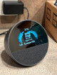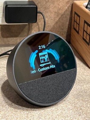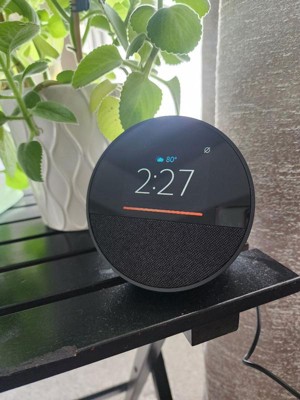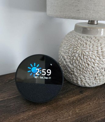 Echo Spot — A sleek smart alarm clock with Alexa and big vibrant sound. Ready to help you wake up, wind down, and so much more. See time, weather, and song titles at a glance, control smart home devices, and more. Personalize your display with your favorite clock face and fun colors. In the box: Echo Spot, Power adapter (15W) and Quick Start Guide.