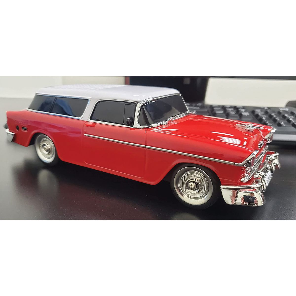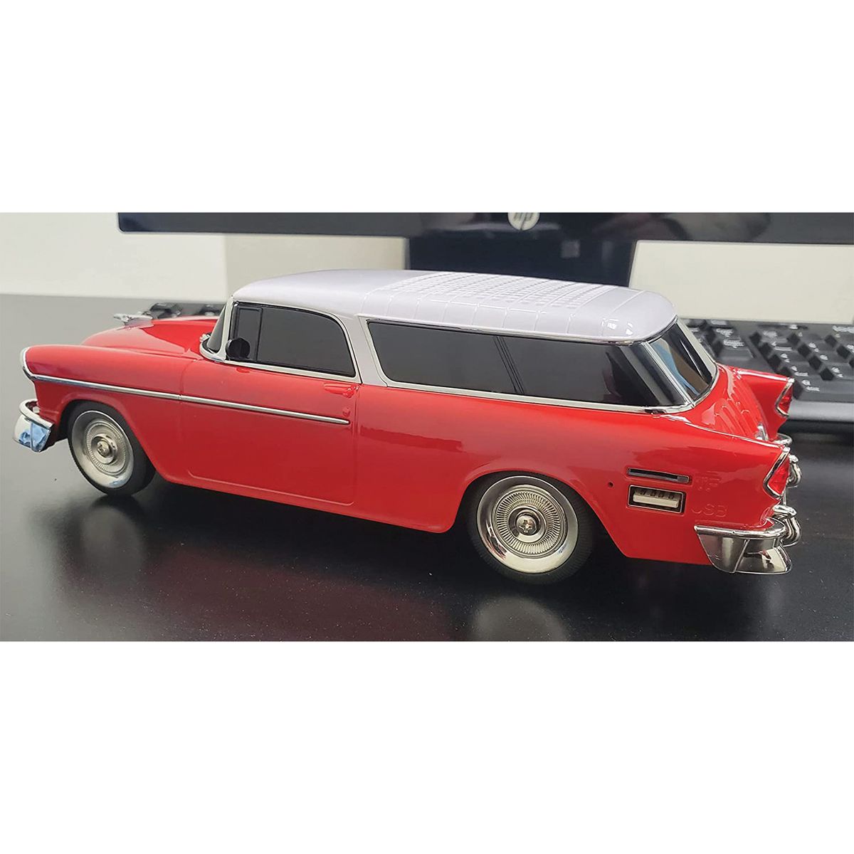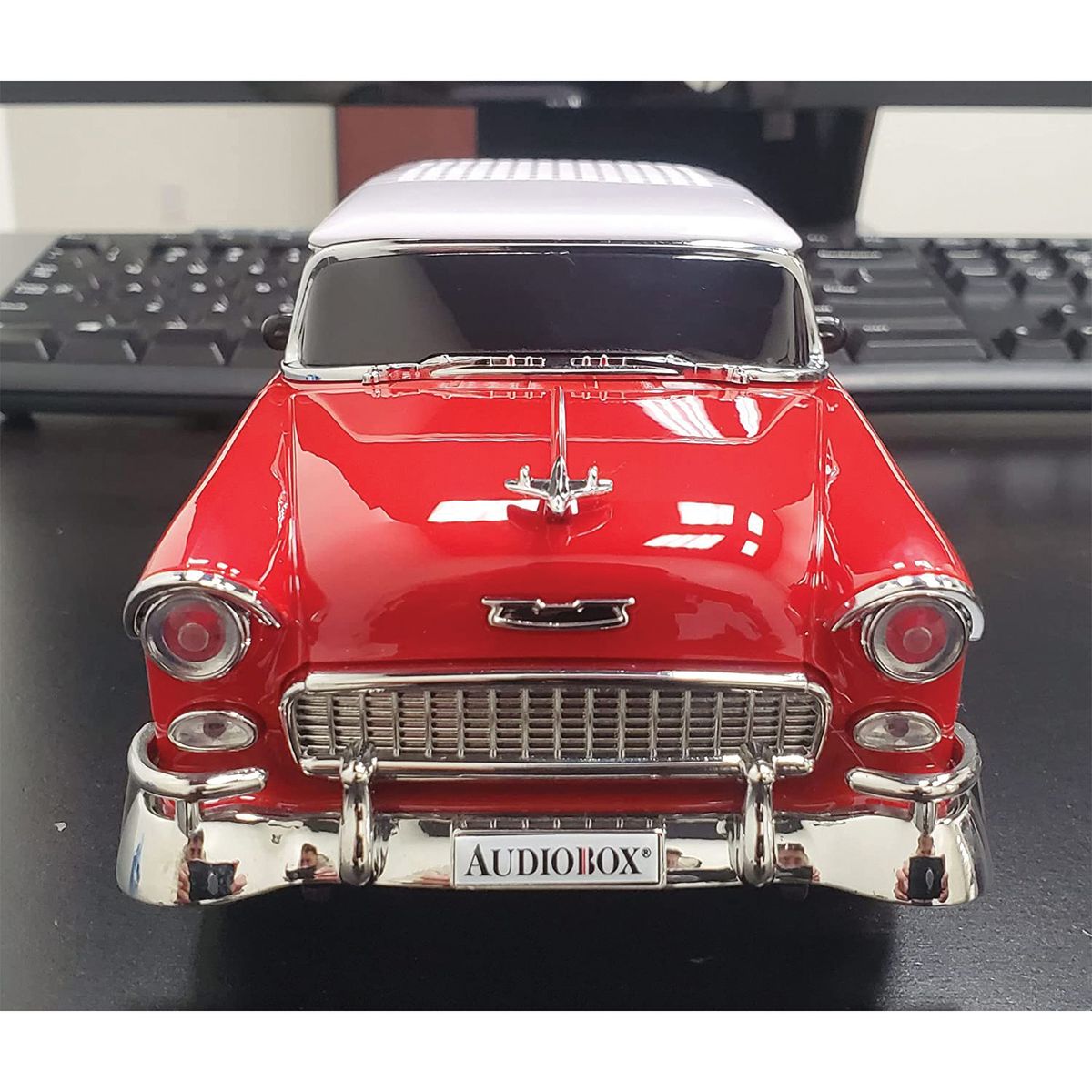 Rev up your tunes with the Retro Ride 1955 Replica Car Speaker in Blue from Audiobox. With its vintage car style design, this speaker is ideal for anyone who loves classic style. The rechargeable battery and USB-C charging port make it convenient and easy to use, while the WaveSync technology allows you to connect multiple speakers for a surround sound experience. You can easily connect a number of audio sources through Bluetooth, USB, microSD Card, 3.5 mm aux, and its built-in FM radio receiver. With a built-in 1,200 mAh 3.7-volt Li-Ion battery and included USB-C charge cable, this retro speaker is ready for a road trip.