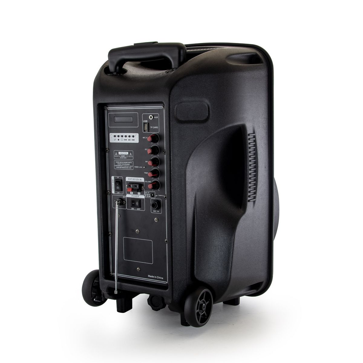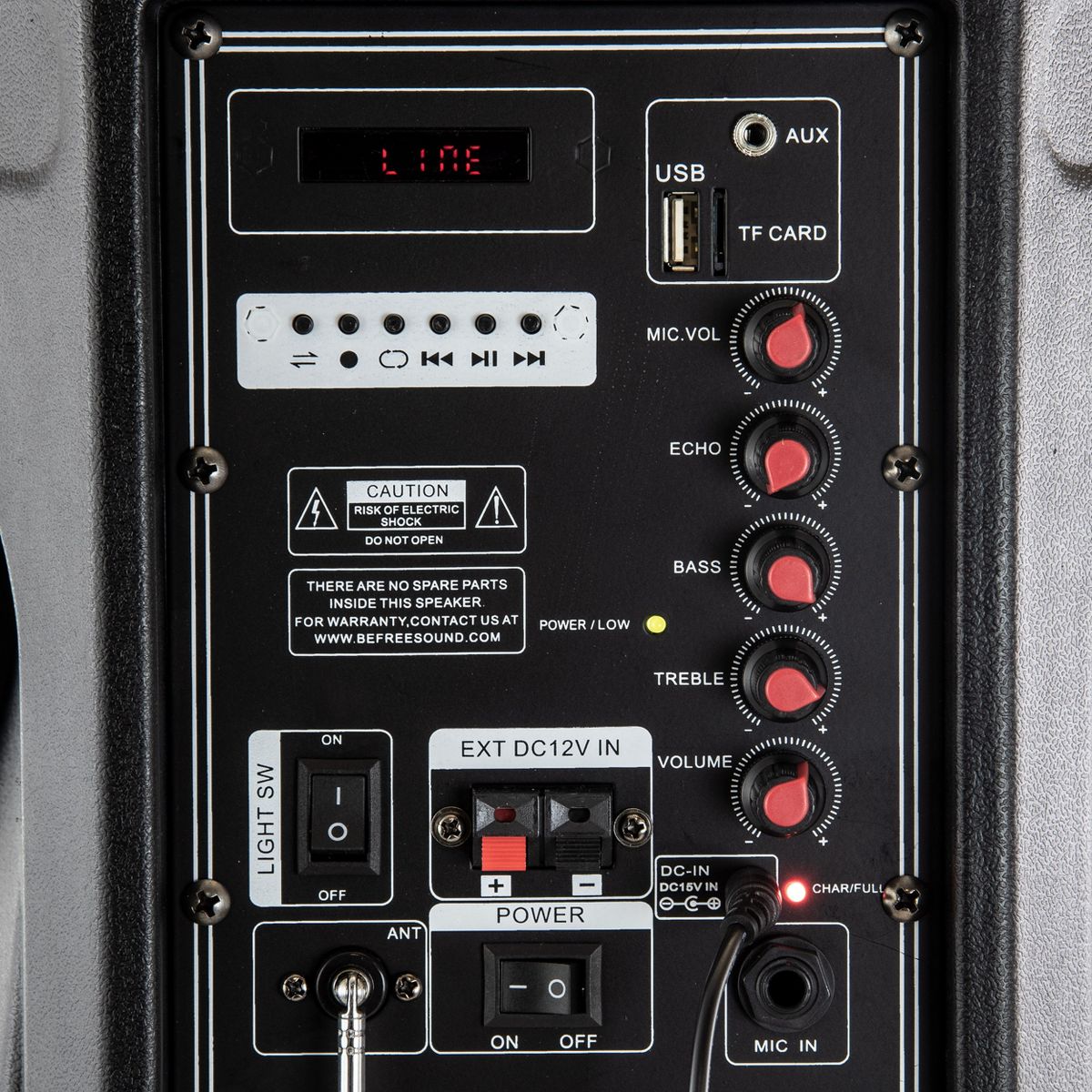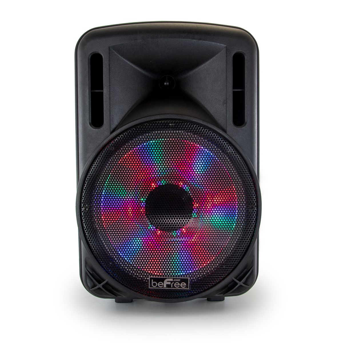 The beFree Sound 12 Inch 2500 Watts Bluetooth Portable Party Speaker with illuminating lights brings more power and sound to house parties and other events. Dazzle the stage with an array of illuminating light patterns built into the speaker. Bring along to camping trips or backyard barbeques, with the portable handle bars and wheels this party speaker can go anywhere. Great for an at home or dive bar karaoke night; this sound set comes with a microphone as well function karaoke controls. Never let the party simmer down, the 12v rechargeable battery can last till the night ends!