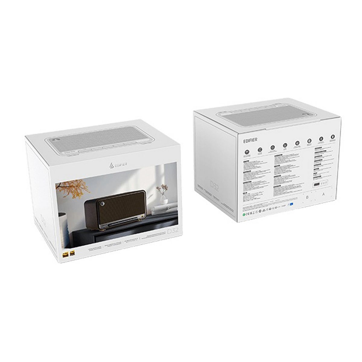 The Edifier® D32 Tabletop Wireless Speaker is a retro-style and fashionable tabletop combo speaker with a handmade wooden speaker case, braided speaker grille, and accordion keyboard. It will complement whatever style your room décor might be. It also can play Hi-Res Audio up to 24 bit/96 kHz end-to-end! The Bluetooth® v5.3 audio receiver supports LDAC codec with a transmission bit rate of up to 990 kbps. It also allows for the simultaneous connection of 2 Bluetooth devices, making it easy to switch between audio sources. The tabletop speaker is also equipped with 2.4- and 5-GHz Wi-Fi® modules. It supports Apple® AirPlay® and AirPlay®2 so you can stream music through Wi-Fi® from your iOS™ devices, Apple TV®, and iTunes®-installed computer to the speaker. Group 1 or more D32 speakers into your multi-room music system and enjoy seamless music listening throughout your house. A high-capacity 7.4-volt, 5,200-mAh battery pack is embedded in the cabinet, providing enough power for continuous playback for up to 11 hours per charge. And the D32 works with the Edifier® ConneX app, where you can access the source switch, playback control, sound effects, etc.