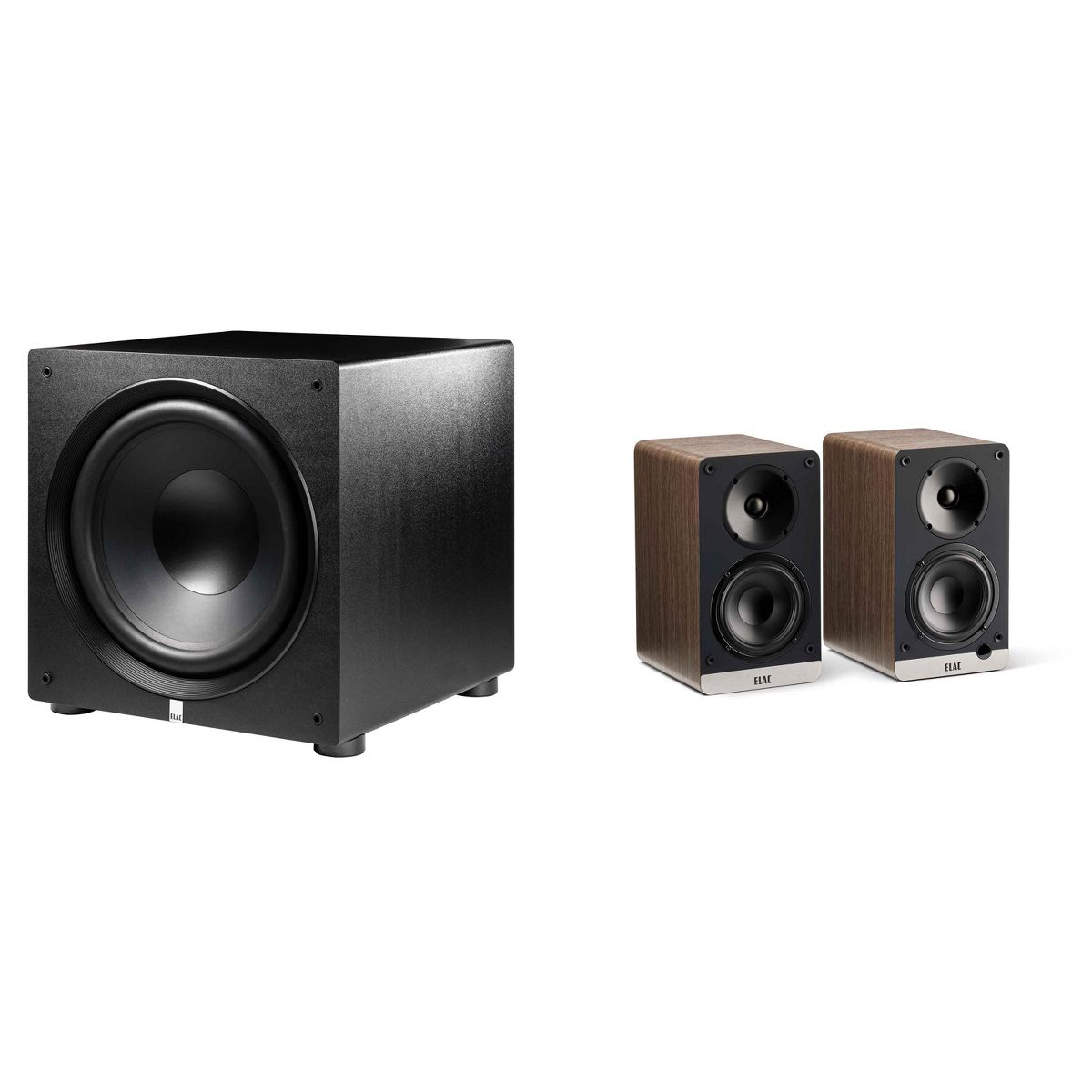 Elac DCB41-WN - Debut ConneX 4.5" Powered Speakers - Walnut, Pair and Elac PS500-BK - Varro Premium 15" 500 Watt Powered Subwoofer with Auto-EQ