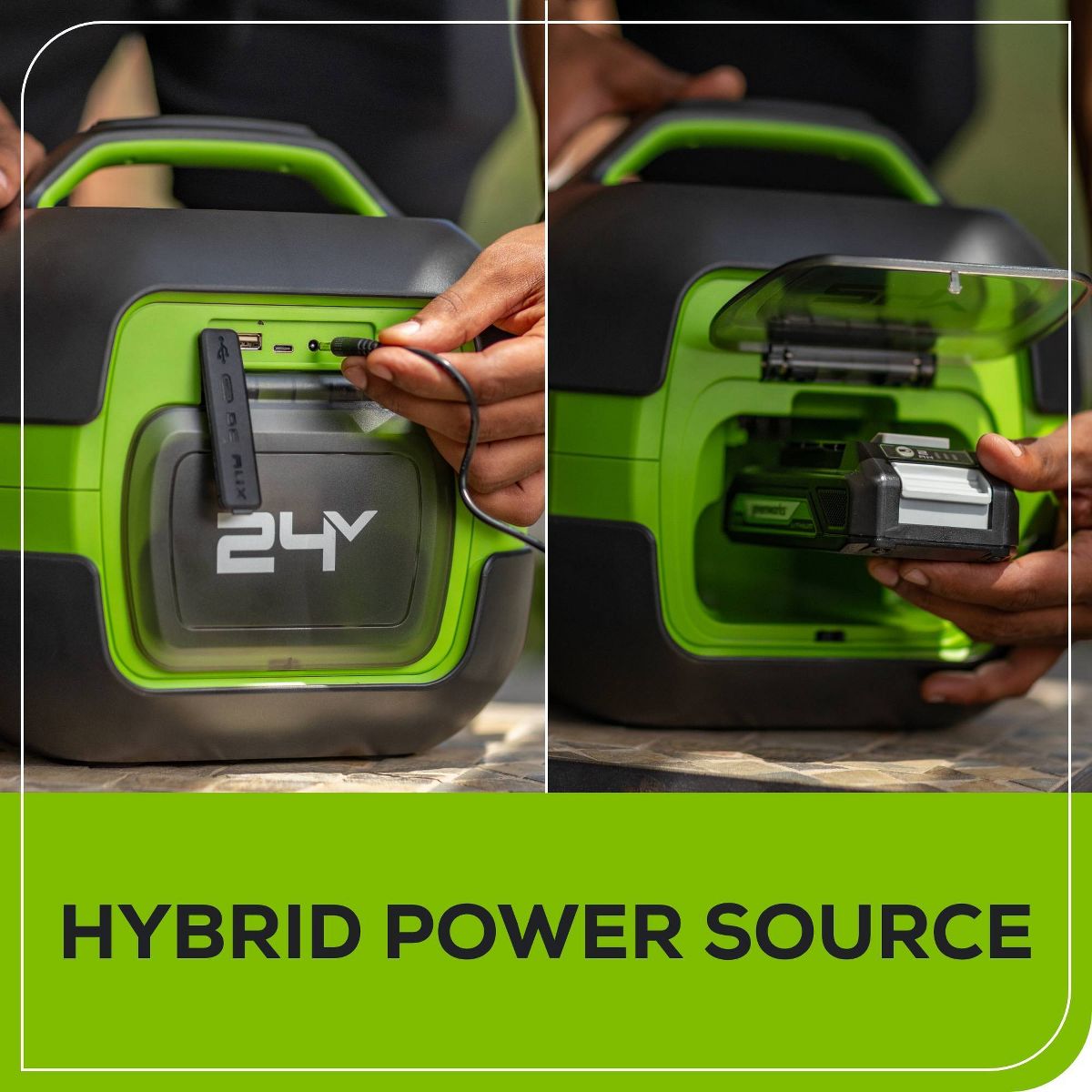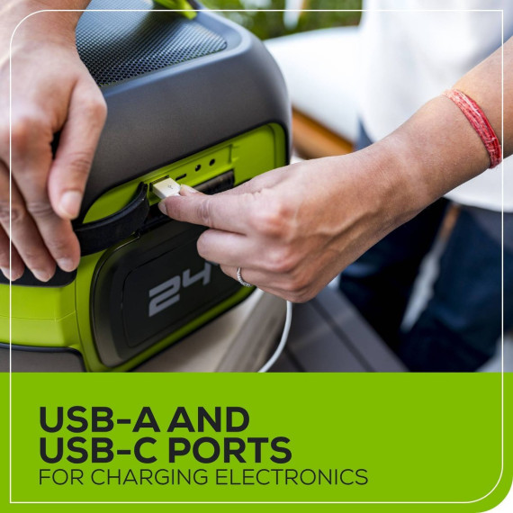 The Greenworks POWERALL™ Cordless 24V Bluetooth Speaker delivers loud and clear sound with its powerful 5.25” woofer and 50-watt amplifier. Listen to your favorite music the way it was made to be listened to with high quality, full surround sound. Effortlessly connect your devices with Bluetooth connectivity ranging up to 164 ft. Its hybrid performance allows you to play wirelessly with the included POWERALL™ 24V 2.0Ah battery or plugged into a power source with the included extension cord. Cordlessly connect to other Greenworks Bluetooth speakers (sold separately) to play music simultaneously and amplify your sound. Featuring a built in USB Type-A and USB Type-C port allowing you to charge other devices such as phones, tablets, and more. The Greenworks POWERALL™ 24V lithium-ion platform powers over 125+ indoor and outdoor products, including lawn mowers, blowers, string trimmers, chainsaws, power tools and more! The POWERALL™ 24V lithium-ion battery provides 20% more power and 35% more run time (compared to 20-volt products) while delivering fade-free power with no memory loss after charging.