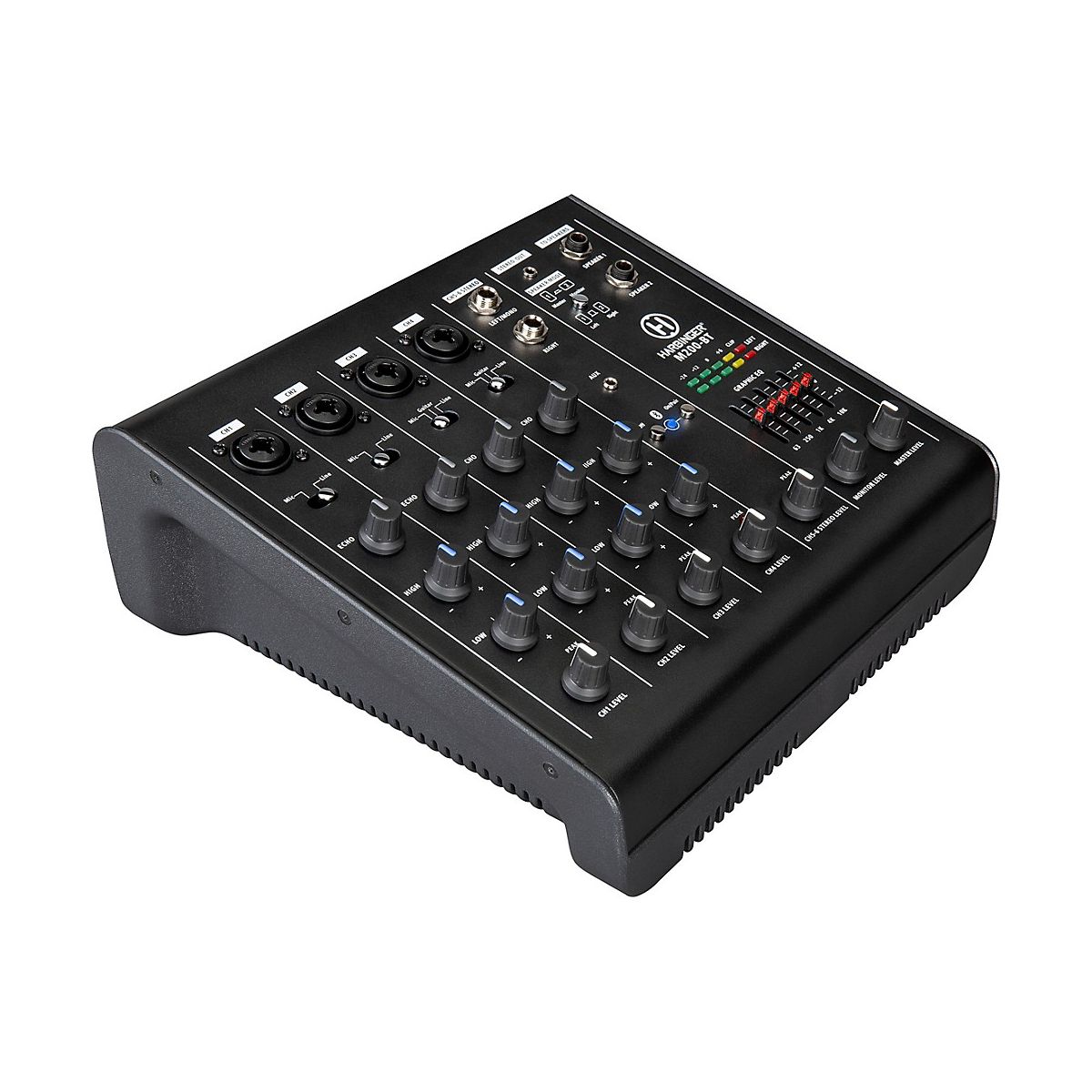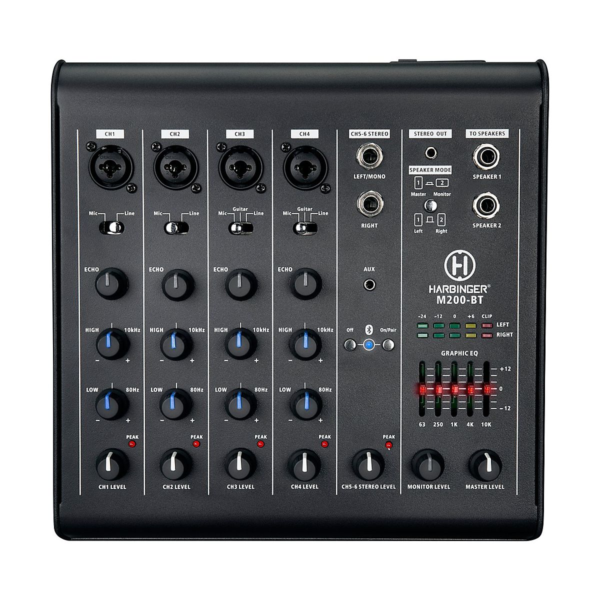 The M200-BT offers a wide range of input flexibility to accommodate bands, solo performers, or presentations. Four mic/line channels allow multiple microphones or instruments to connect simultaneously, and two guitar inputs provide direct connectivity for acoustic or electric guitars. Each channel includes High, Low, and Echo controls, offering precise tone shaping and effects for vocals and instruments. A 5-band graphic EQ provides additional adjustments to tailor sound to the venue or audience.