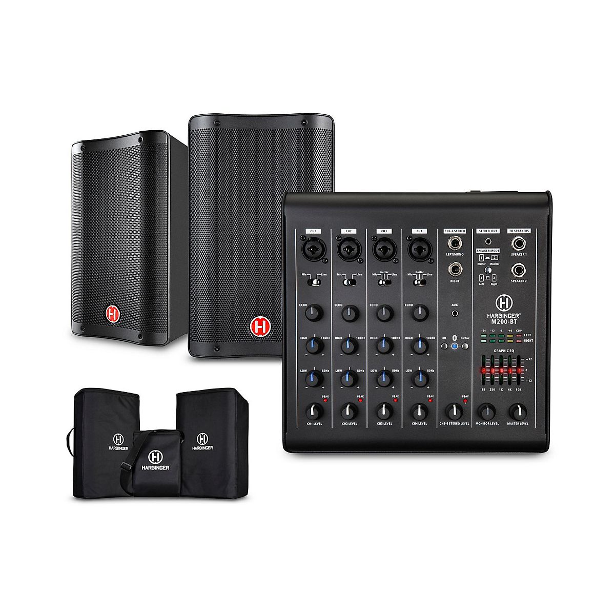 The Harbinger M200-BT portable PA with Bluetooth and custom carry bags offers a versatile, high-powered solution for small venues and portable sound needs. With reliable connectivity, flexible inputs, and protective transport options, this system is designed to deliver consistent sound wherever play or present.