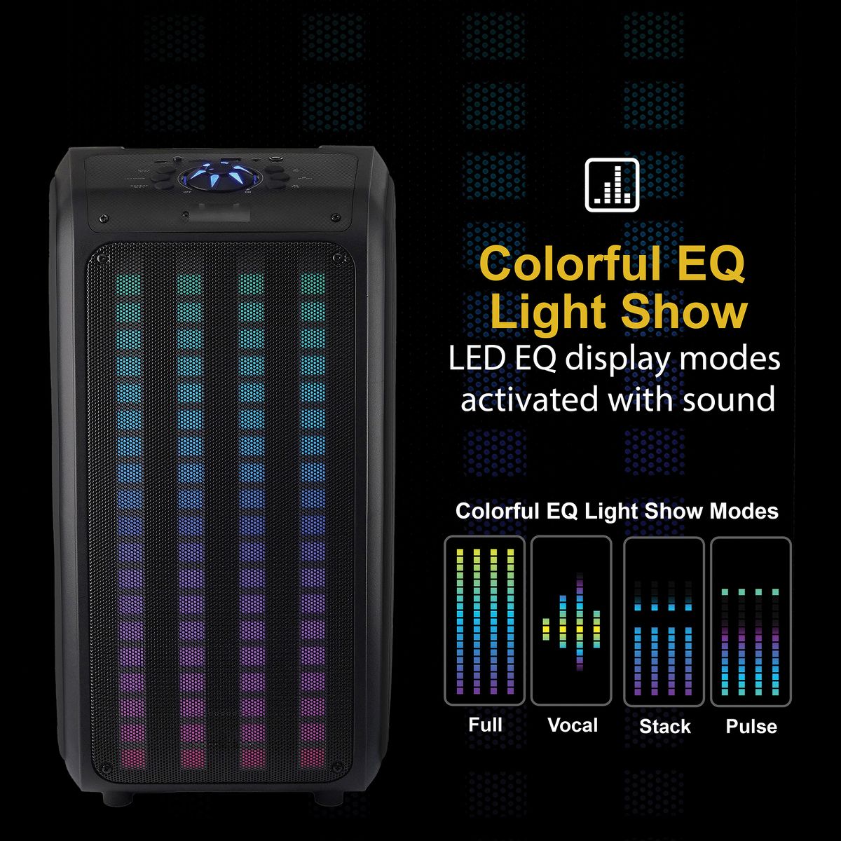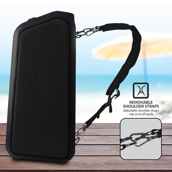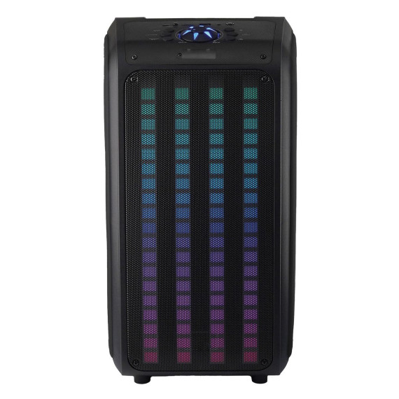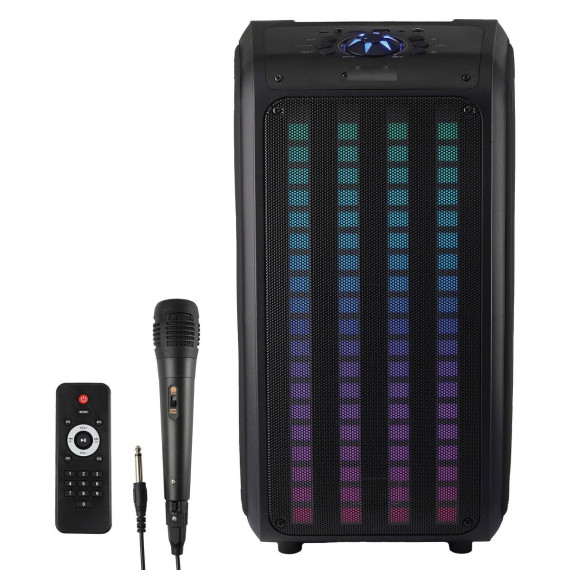 The IQ-8265BT Sound Traveler from IQ Sound® is the ultimate portable backpack speaker that delivers superior audio performance and versatility. Whether you're hosting a party, going camping, attending a festival, giving a talk, or simply want to listen to your favorite tunes on the go, this speaker system is the ideal choice. It features two 6.5-in. drivers that deliver rich, clear, and powerful sound. With its built-in Bluetooth® 5.0 technology, you can easily stream music from your smartphone, tablet, or other devices. Its LED light panel adds an extra layer of fun, with colorful lights dancing to the beat of your music. The party speaker also features True Wireless Stereo (TWS) technology, allowing you to connect a second Sound Traveler (sold separately) via Bluetooth® for an even more immersive audio experience. But what truly sets the IQ-8265BT apart is its flexibility and convenience. You can connect your non-Bluetooth® external audio devices via USB, microSD™, or aux inputs. It also has an FM radio, a microphone input with an included wired microphone, and a remote. This portable backpack speaker also has adjustable and removable shoulder straps, built-in rechargeable battery, and a play time of approximately 4 to 6 hours, making it a convenient and flexible choice for music lovers on the go. So, whether you're a DJ, music lover, or just want to add some excitement to your next outdoor adventure, the Sound Traveler Backpack Speaker has you covered.