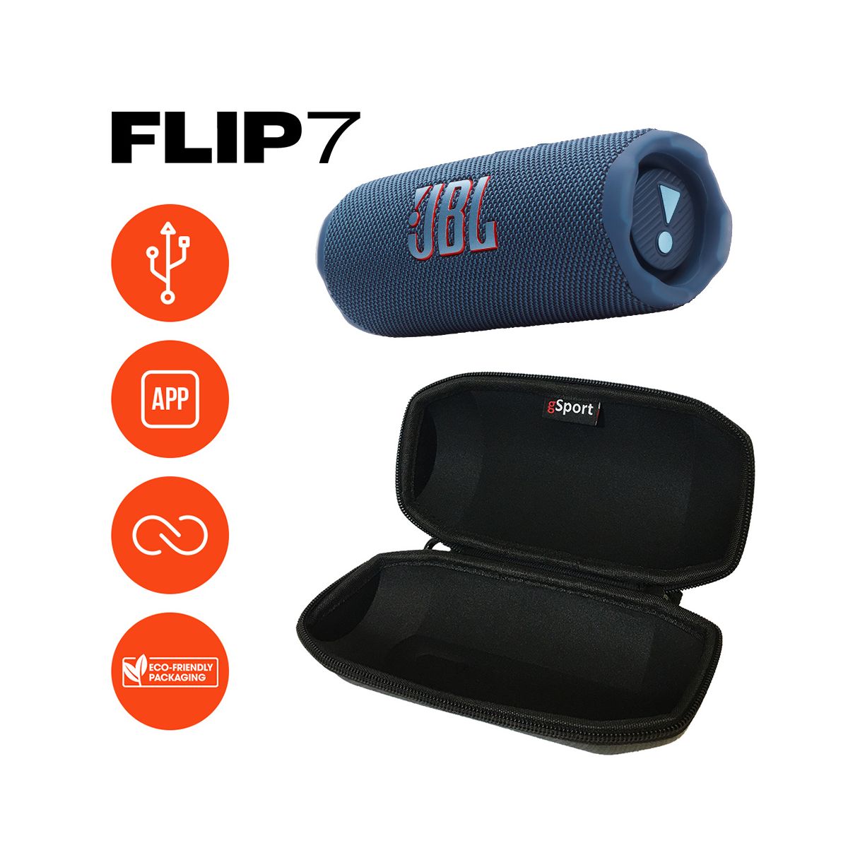 Bold sound for every adventure and the soundtrack to your life right in the palm of your hands. The JBL FLIP 7 is undefeated JBL sound that travels with us wherever we go. Because music has no boundaries and neither should we. Whether we’re hosting a beach party relaxing in your backyard or setting the mood for a cozy night in the FLIP 7 is designed to enhance any experience anywhere life takes us. And now your signature sound is bigger and bolder than ever thanks to JBL’s AI Sound Boost. The end result? The FLIP 7 leaves your friends and family wondering where all that big glorious sound could possibly be coming from. But it’s not just pretty and powerful. The FLIP 7 takes a beating without missing a beat boasting industry-leading IP68 waterproof dustproof and drop-proof. Plus with new Playtime Boost we can enjoy up to 16 hours of playtime—because the moment should only ever stop on your terms. Wouldn’t it be great to share the sweet sound of JBL far and wide? Now we can. Effortlessly connect with other Auracast-enabled JBL speakers to cover more ground (and more ears) with the same playlist whether we’re touring the town with your cycling crew or extending your dinner party to the back patio and the front yard. In short this is not the average portable speaker. It’s a pint-sized audio boss. Our Exclusive Bundle includes a gSport Carbon Fiber protective hardshell carrying case that holds your JBL FLIP 7 and its accessories.