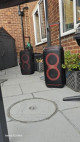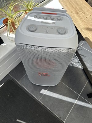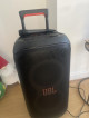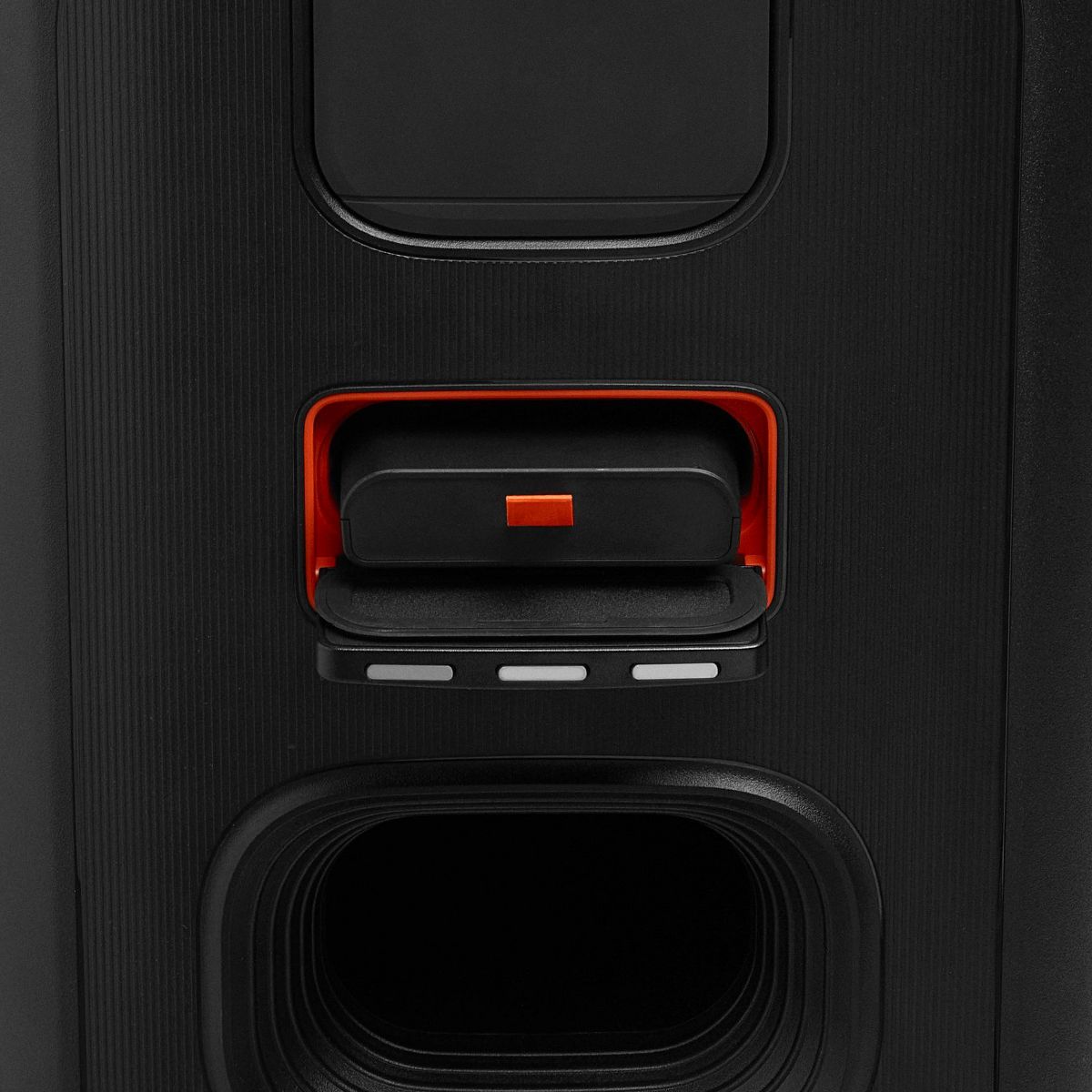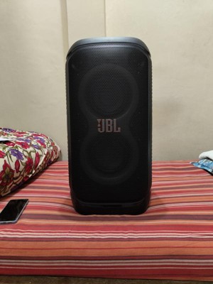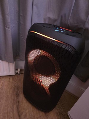 With the JBL PartyBox Stage 320, you can get the party started anytime, anywhere. Transform any space, inside or outdoors, into a dance floor. Powerful JBL Pro Sound and big thumping bass fill a wide soundstage and get the crowd moving, while their eyes are delighted by an adaptive lightshow of swirling starry lights, cool light trails, and amazing strobe effects synced to your beat. Use the mic and guitar inputs to show off your stage presence. You can steer the party's flow throughout the night with fun interactive party effects. The solid telescopic handle and wide, sturdy wheels mean you can roll the JBL PartyBox Stage 320 just about anywhere, and once you're there, the splash-proof construction means a little rain won't ruin the fun. Best of all, it delivers up to 18 hours of playtime—and if the good times are still rolling, just swap out the replaceable battery and keep going. For an even bigger party, it's easy to connect or use the JBL PartyBox app to connect multiple JBL Auracast-enabled speakers wirelessly. Bring people together and elevate the experience with the JBL PartyBox Stage 320.