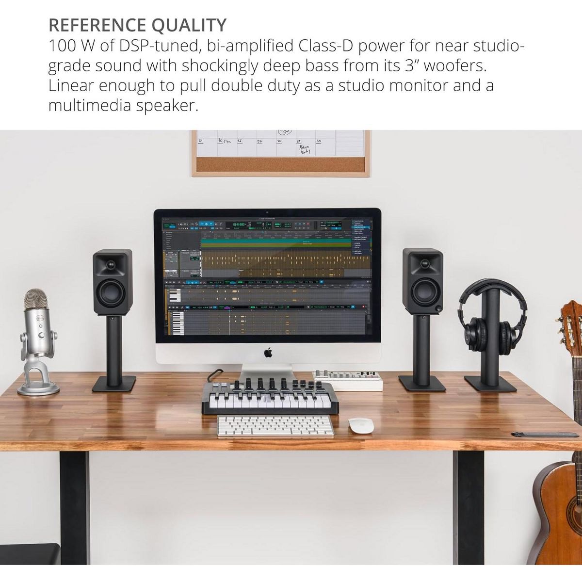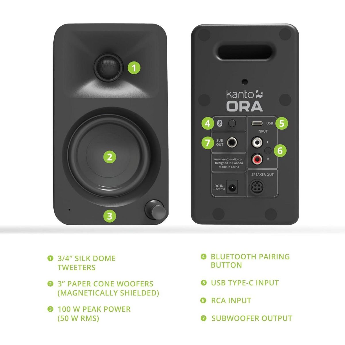 ORA bridges the gap between computer speakers and studio monitors giving you studio-grade, audiophile-approved sound without dominating your space. ORA has modern inputs like USB-C to get the best sound from your PC or Mac, Bluetooth 5.0 to pair with your phone or smart home device, and RCA for your analog gear. Sporting a crossover that automatically sends bass to a connected subwoofer, you get flawless low-end integration freeing up the 3” woofers and ¾” silk dome tweeters to focus on what they do best. ORA is the perfect blend of reference-quality sound and modern features at a compact size to fit on your desktop.
