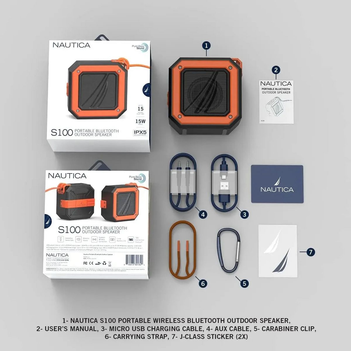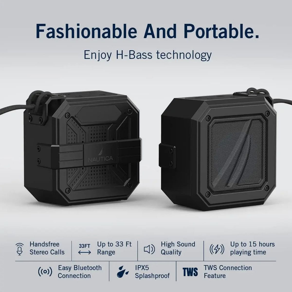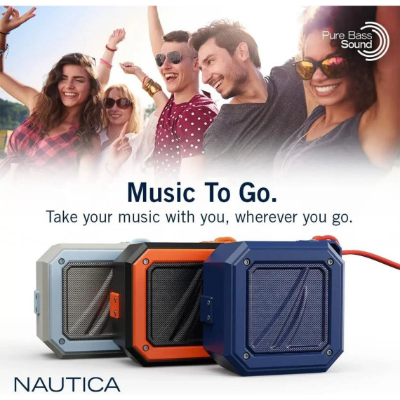 ABOUT THE NAUTICA S100 Portable Speaker The Nautica S100 Bluetooth Portable Speaker combines rugged durability, flexible playback options, and exceptional audio quality. Built for outdoor adventures, this IPX5-rated water-resistant outdoor Bluetooth speaker ensures reliability in challenging conditions. This wireless speaker with Bluetooth functionality offers multiple connectivity options, including USB, Micro SD, AUX, and Bluetooth 5, delivering up to 10 meters of wireless freedom. With 15W PMPO output and the TWS feature, you can pair two units for true stereo sound, achieving up to 30W PMPO for a live-performance experience. Equipped with a 1200mAh battery, this travel speaker supports up to 15 hours of continuous playtime and 200 days of standby. Vibrant color choices, a convenient carabiner, and a durable strap make the Nautica S100 a stylish and practical addition to any adventure. Add this waterproof speaker to your collection of travel accessories today, this cool gadget is the perfect camping companion, beach vacation essential, festival essential, and everyday music player.