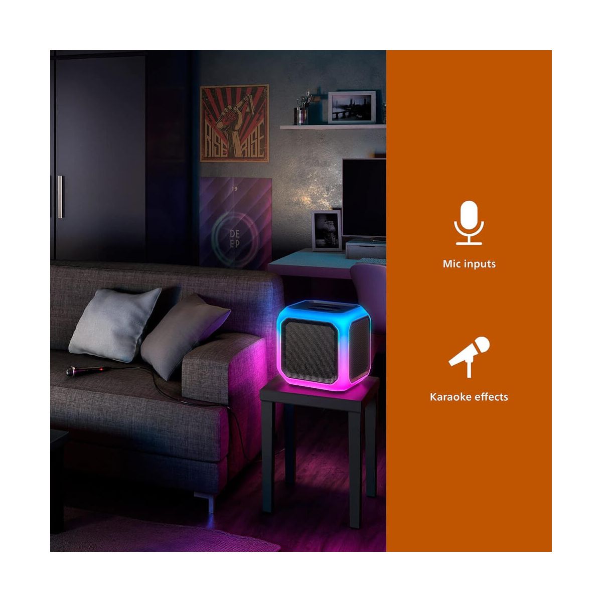 Extra-Heavy Bass This Karaoke Cube Speaker Will Immerse the Room in Rich Sounds and Banging Bass. 2.1 Channels Thump Out 160 W Maximum Power, Just What You Need to Get Your Party Started. Party All Day The Built-In Battery Offers 12 Hours of Playtime with a Single Charge, So You Can Keep the Party Going All Day. 360 Colorful Party Lights Glowing Light Bars Pulse Through the Semi-Transparent Speaker Creating a Futuristic 360 Light Show to Accompany Your Tunes. The Lights Will Change Color and Pulse Along with Your Music. Build a Wall of Sound PartyLink Mode Lets You Connect Up to 50 Speakers at Once. A Handle at the Top and the Cube Design Allow You to Easily Stack Speakers on Top of Each Other. Create a Wall of Sound with a Glowing Mesh of Lights. Take Center Stage 2 Mic Inputs Allow You to Kick Your Party into Karaoke Mode. Take It Up a Notch with Echo, Female/Male Voice Switch, and Vocal Fader Voice Effects. Both Mics and Effects Have Their Own Controls on the Speaker. Wired or Wireless Stream Your Tunes via Bluetooth. Easily Connect Other Devices via Audio-In or USB. You Can Also Connect to Another Speaker or Amp Using the Line-Out Socket. Anytime, Anywhere The Built-In Carry Handle and Battery Means You Can Take This Speaker Anywhere. Karaoke at a Friends House or Dance All Night on the Roof, Its All Up to You..