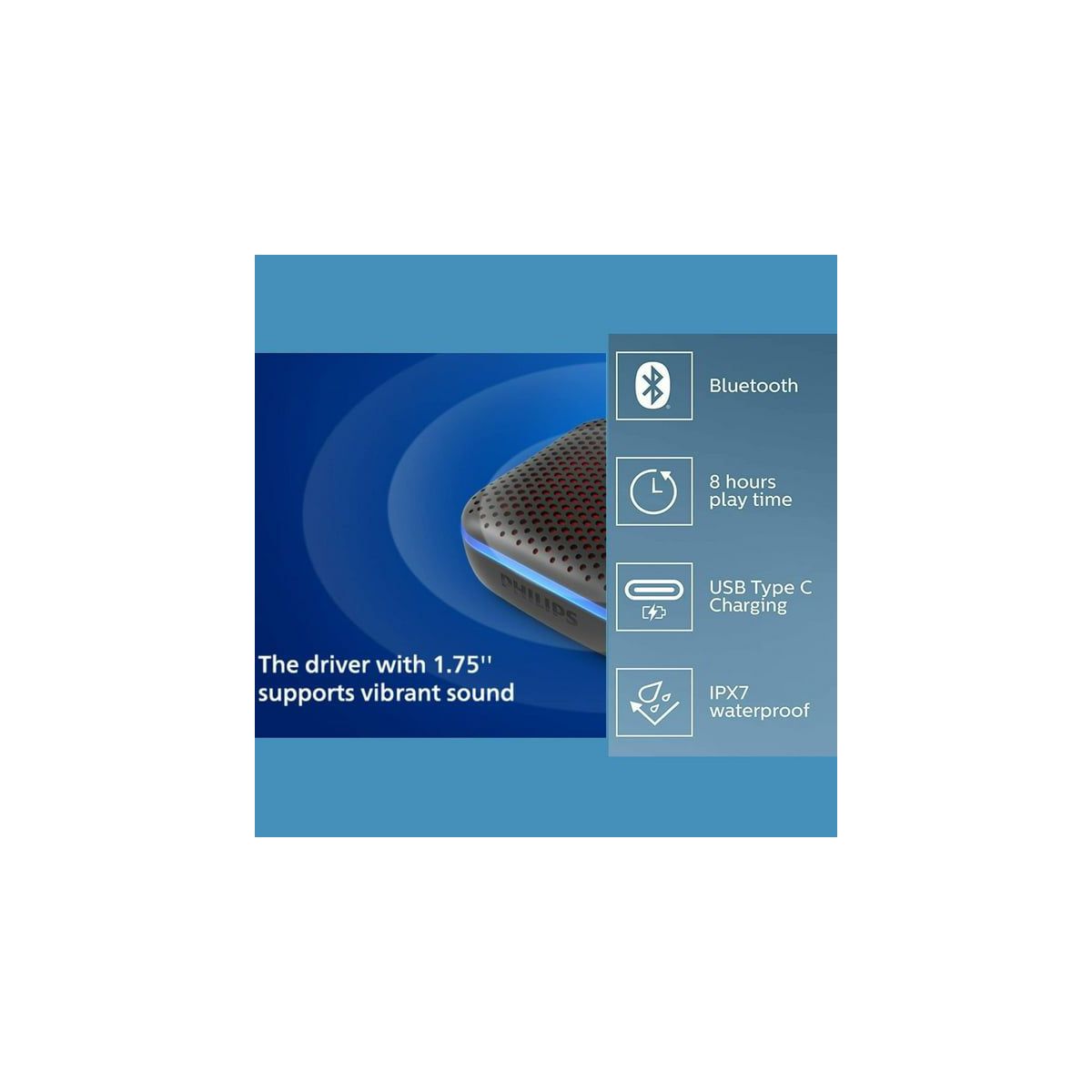Ready to take the party anywhere? Our wireless bluetooth speaker can help! With its incredibly small size, this portable speaker has been designed with bluetooth for maximum convenience, so you can stream your favorite music on the go. This mini speaker uses full-range drivers to ensure clear highs and lows and gives you a full-bodied sound experience. Thanks to its IPX7 waterproof rating, our bluetooth speaker can stay submerged up to 1m deep for a duration of 30 minutes, allowing you to bring this wireless speaker to any poolside gathering, beach excursion, or even shower use. Take Philips Wireless Bluetooth Speaker anywhere you go for exceptional music listening. Featuring a bright, multicolored LED light, our portable bluetooth speakers will provide the perfect ambience as you jam to your favorite songs. Plus, these wireless speakers have a built-in microphone that allows you to easily answer incoming calls without any hassle. Our light up portable bluetooth speaker is equipped with an 850mAh built-in rechargeable battery that can provide up to 10 hours of playtime and can be recharged in just 2.5 hours. You can recharge our bluetooth speakers using the included USB C charging cable. Lightweight and portable, our bluetooth speaker makes for an ideal traveling companion for your outdoor excursions. This wireless bluetooth speaker comes conveniently with a carry strap that can be securely attached to backpacks or belts. For everyone from serious audiophiles to those who just want to hear their tunes, the Philips Wireless Bluetooth Speaker offers an experience you don't want to miss. Add this to your cart today.