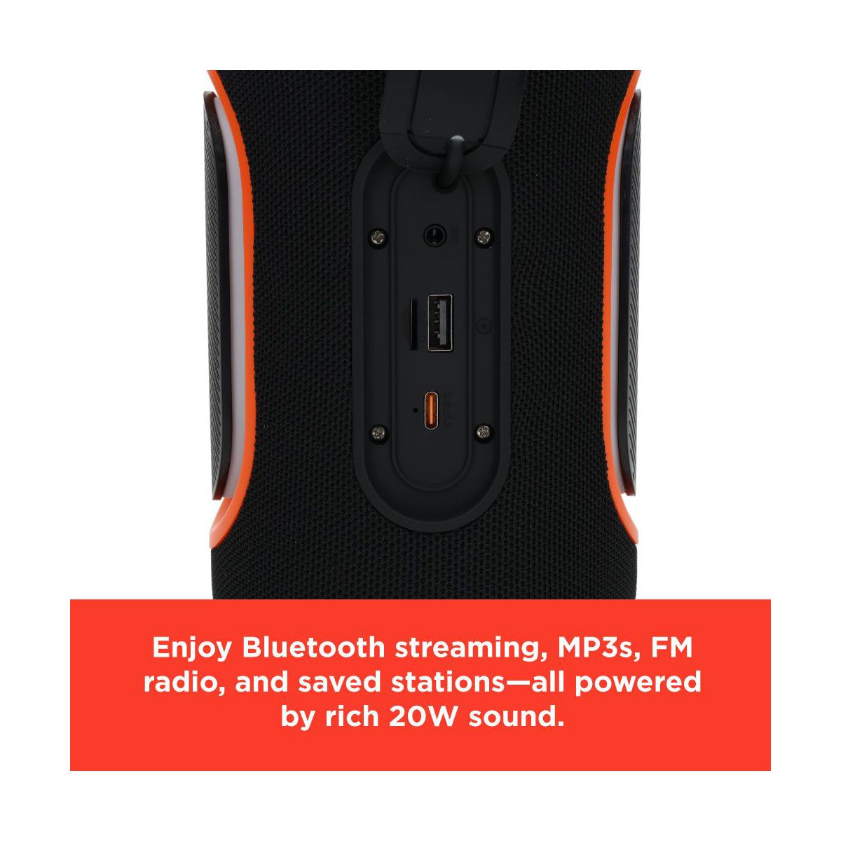 A 20W speaker with dual 57mm drivers and vibrant RGB lighting, offering Bluetooth 5.3, MP3, FM, TWS, U disk, TF, and AUX playback. The 3600mAh battery provides 4–6 hours of music, and the compact IPX5 build with memory function is perfect for indoor and outdoor fun.