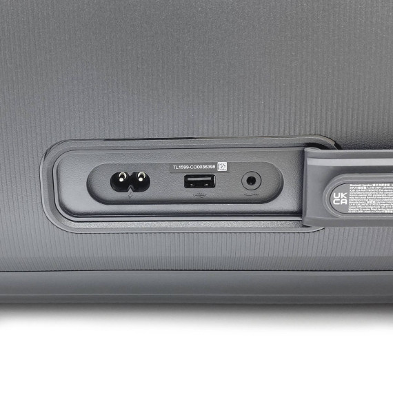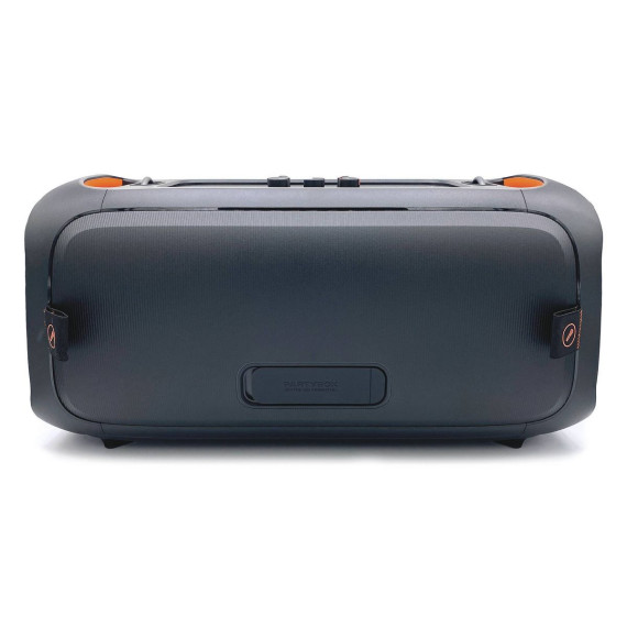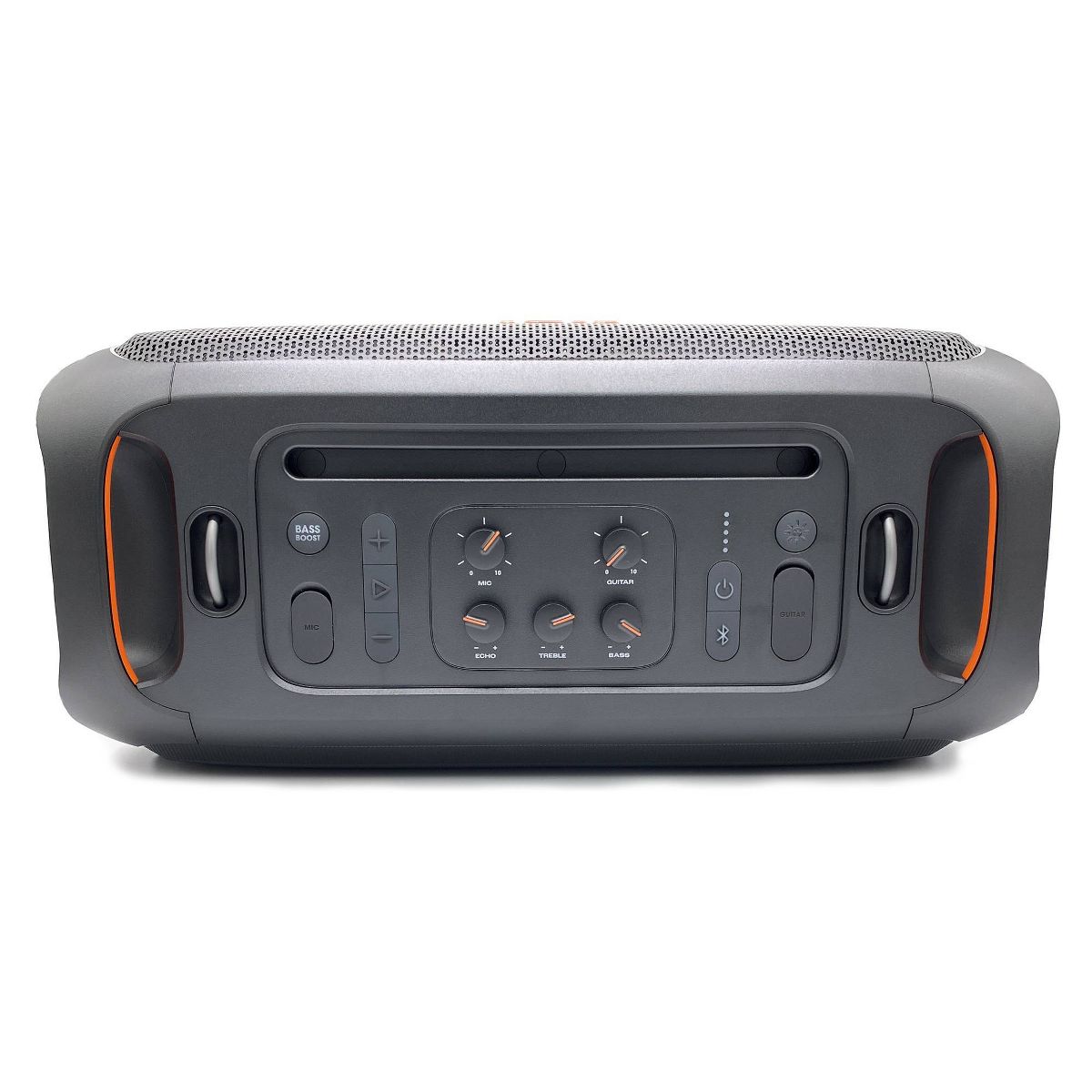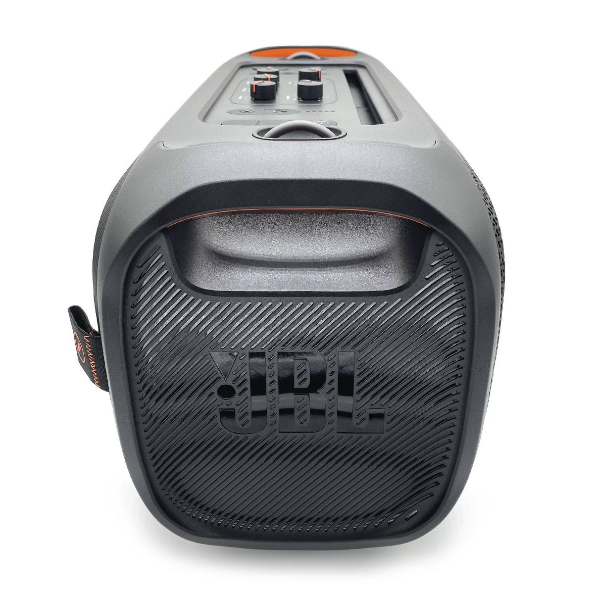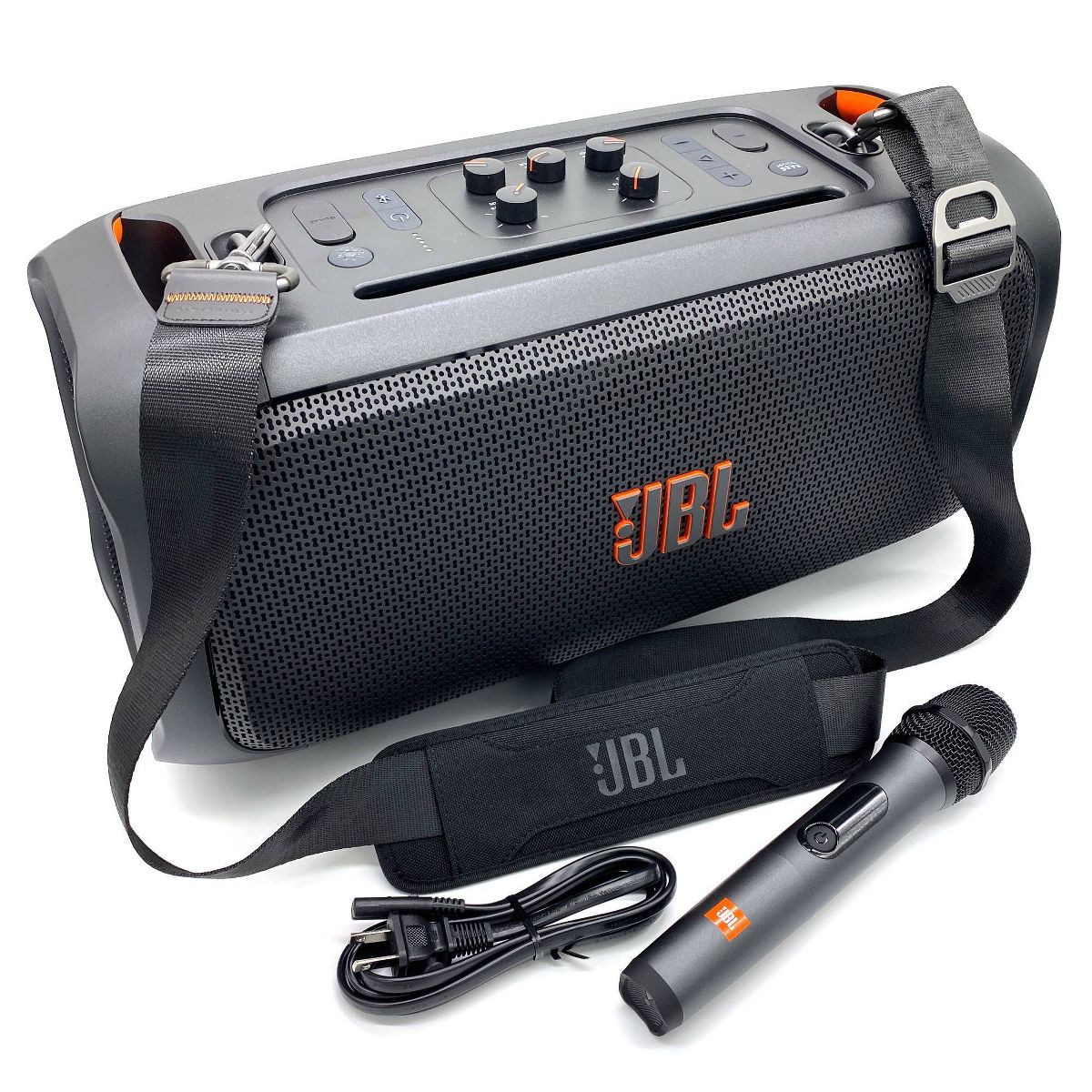 From beach parties to festivals, the JBL PartyBox On-The-Go Essential lets you see, hear and feel the beat. Turn it up loud with 100 watts of powerful JBL Pro Sound, synched to a dazzling light show. Access your favorite tunes with Bluetooth, USB, AUX and TWS (True Wireless Stereo) connectivity, grab a friend and sing your hearts out with the JBL wireless mics, or use the guitar input to play along. With a bottle opener, padded shoulder strap, rechargeable battery and IPX4 splash-proof protection, the JBL PartyBox On-The-Go Essential has everything you need to get the party started—and take it with you.