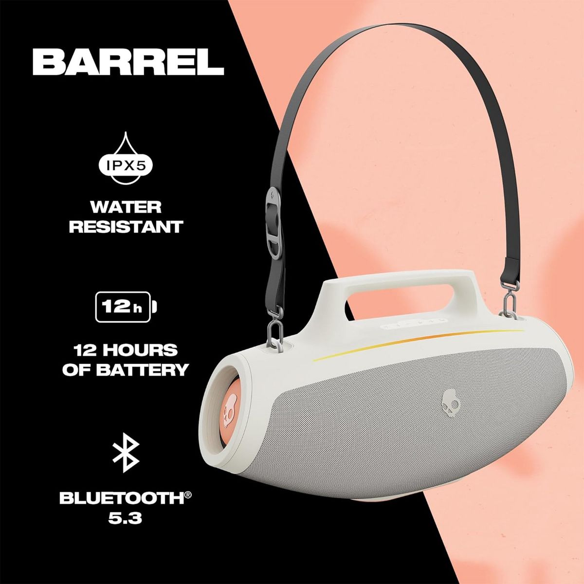 The Skullcandy Barrel Bluetooth Boombox Speaker is designed for portability with a built-in carry handle and included carrying strap. Easily carry your music with you wherever you go. Plus, with the unique Multi-Link functionality, you can connect your Barrel to up to 99 other Skullcandy Bluetooth speakers for an even bigger sound.