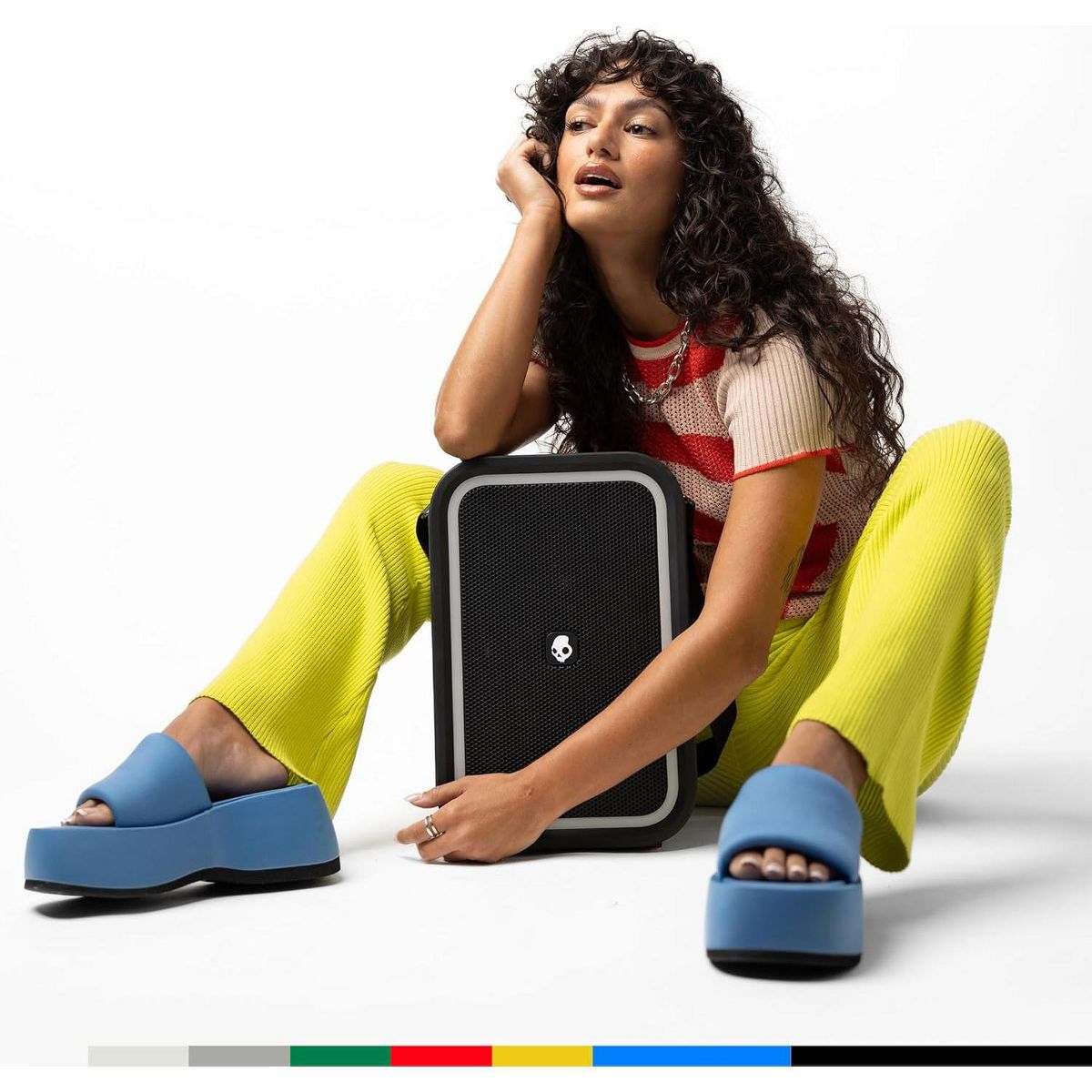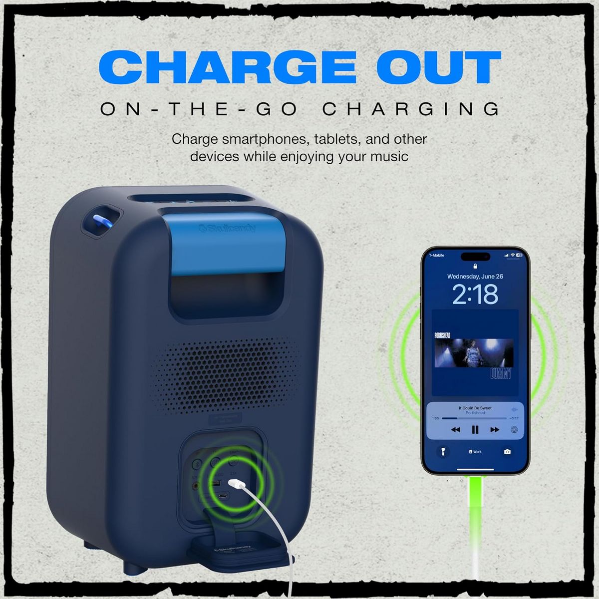 Get ready to take your party to the next level with the Skullcandy Stomp Bluetooth Speaker. This portable speaker is not your regular sound system, it's a portable party machine! With its waterproof design, it's perfect for outdoor use, whether you're throwing a beach party, hiking, camping or just chilling in the backyard. The IPX7 waterproof rating means you don't have to worry about a sudden rainstorm ruining your sound. With the Skullcandy Stomp, you also get to enjoy a mesmerizing LED lightshow that can add a dynamic, festive touch to any event. The multi-function LED lights can dance to the beat of your music, setting the mood for a memorable night. But don't worry about running out of power. Our portable bluetooth speaker comes with a 12-hour battery life to keep the music playing all day or all night long. If your phone or other devices are running low on battery, you can simply plug them into the USB-C or USB-A output for a quick charge. The Skullcandy Stomp Bluetooth Speaker is designed for portability. Its built-in carrying handle is designed for you to easily take your music with you wherever you go. Plus, with the unique Multi-Link functionality, you can connect your Stomp to up to 99 other Skullcandy bluetooth speakers for an even bigger sound experience. The Skullcandy Stomp is everything you need for a great outdoor party. It's a portable speaker, it's a waterproof speaker, it's an outdoor speaker, it's a Skullcandy Stomp speaker. It's all these and more. So, why wait? Start your party with a bang with the Skullcandy Stomp Speaker!