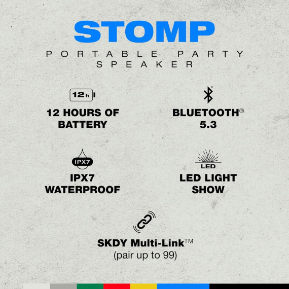 Skullcandy Stomp Bluetooth Speaker – IPX7 Waterproof Wireless Portable Speaker, with LED Lightshow & Strobe Modes, 12 Hour Battery, Multi-Link