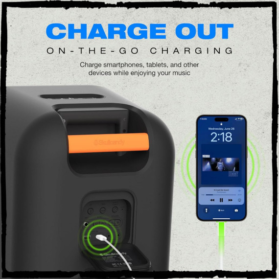 Block Party on Wheels: Most outdoor speakers fall flat, but this wireless beast brings it all—bright highs, rich mids, and punchy bass boosted to the max. Crank it up and feel the vibes! IPX5 Splashproutdoor Speaker: There’s no need to pack up the music if a little rain threatens your outdoor party — Stomp XXL can handle it. With an IPX5 splash proof rating, it can be caught in a full-on downpour and come out cranking. Plenty Loud for any Crowd: Is your small gathering turning into a 5-alarm rager? With a simple press of a button, Multi-Link can connect up to 99 other Skullcandy Bluetooth speakers, so it can handle any size room and any number of people. Stomp XXL also features an LED light bar & strobe light that syncs wit the music to bring the beats to life. Long-Lasting Battery & USB Charge Out: With up to 12 hours of battery life, the Stomp XXL wireless Bluetooth(tm) speaker keeps the party going all night long and won’t end the party with an awkward silence. It also has USB-C & USB-A charging output so that your mobile devices can always stay charged. Take the Party Anywhere: Stomp XXL is your portable Bluetooth speaker with built-in wheels and a carry handle for easy cruising. Roll out and rock your tunes wherever, whenever!