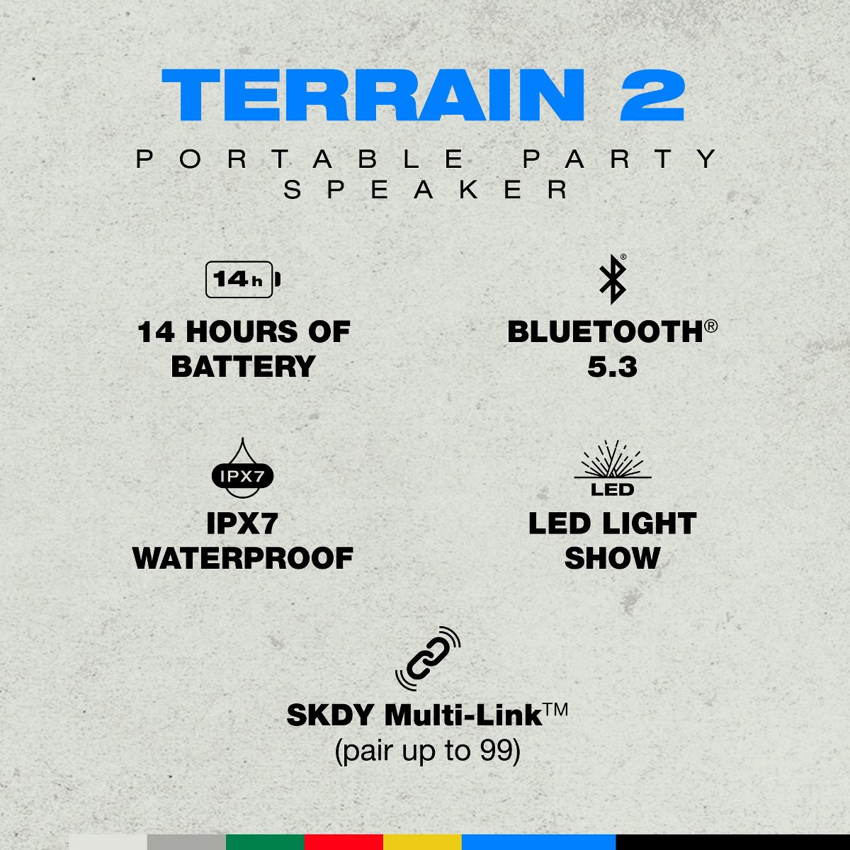 Experience incredible sound and bold features with the Skullcandy Terrain 2 Wireless Bluetooth Speaker. This compact and portable speaker is designed to keep up with your active lifestyle, delivering powerful audio and seamless connectivity wherever you go. The IPX7 water-resistant design makes it perfect for beach days, poolside hangouts, or outdoor adventures, ensuring your music keeps playing no matter the conditions. The Terrain 2 features Bluetooth 5.3 for a reliable connection, while its multi-link technology allows you to link up to 99 speakers for an immersive sound experience that fills any space. Enjoy a stunning visual element with LED lights that sync to your music, creating a captivating light show to enhance every song. Boasting a 14-hour battery life, the Terrain 2 keeps your playlist going all day long, whether you're hiking, relaxing, or celebrating with friends. Its lightweight design makes it easy to carry, while the rich, powerful bass ensures your favorite tracks sound better than ever. Ready to elevate your music experience? Order the Skullcandy Terrain 2 Wireless Bluetooth Speaker today and take your sound wherever you go!