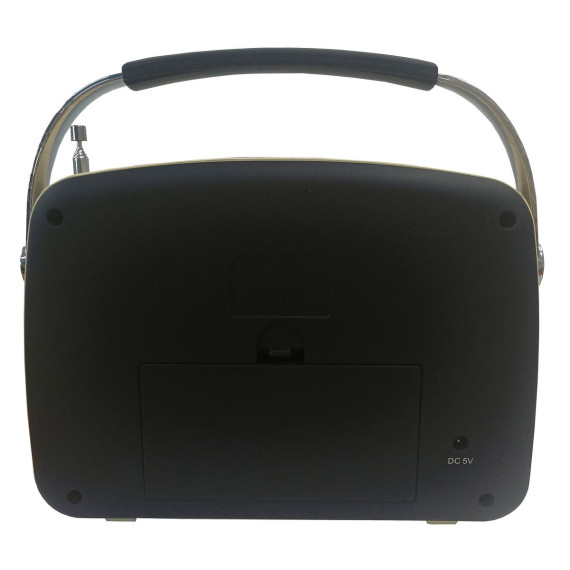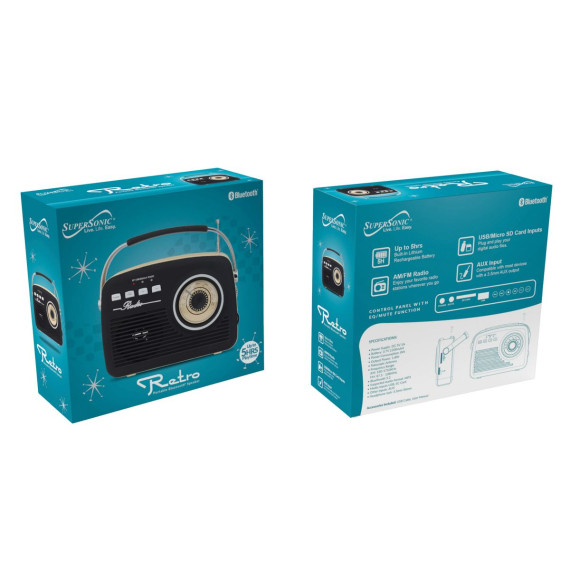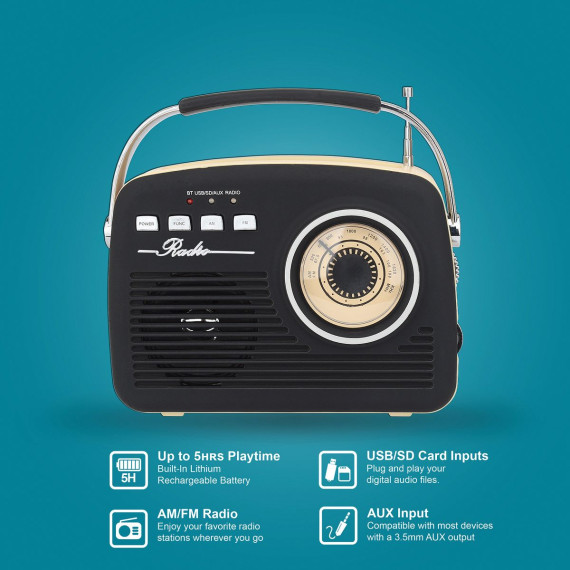 Step back in time with the Black Supersonic Retro Portable AM/FM Radio, a harmonious blend of modern technology and classic design that effortlessly evokes the fashionable spirit of the 50s and 60s. With its vintage aesthetics and an array of modern features, this Bluetooth radio is a true nostalgia-inducing gem. Featuring Bluetooth v5.2 connectivity, you can seamlessly stream your favorite tunes from any compatible device. And with its built-in AM/FM radio, you'll be able to appreciate the timeless appeal of radio waves. Multiple input options — including USB, SD Card, and AUX — ensure your music sources are as diverse as your taste. The telescopic antenna delivers crystal clear reception, and the up to 5 hours of playback time ensures you can groove all day long. Charging is a breeze with the included USB cable, and the 3.5-mm headphone jack allows for private listening.